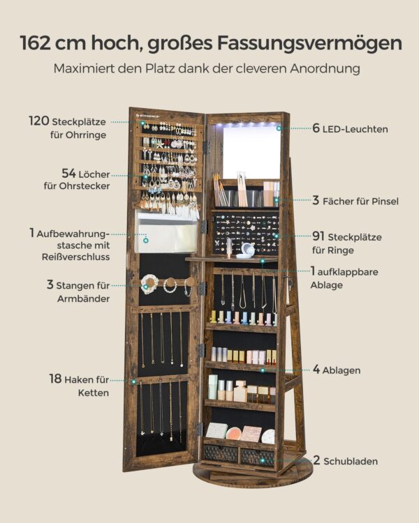 Ši spintelė ne tik suteikia vietos jūsų papuošalams, bet ir yra stilingas interjero akcentas. Jos tvirtas MDF konstrukcija užtikrina ilgaamžiškumą, o aksominis vidus apsaugo jūsų brangakmenius nuo įbrėžimų. Integruotas veidrodis leidžia patogiai pasitikrinti savo išvaizdą prieš išeinant iš namų.