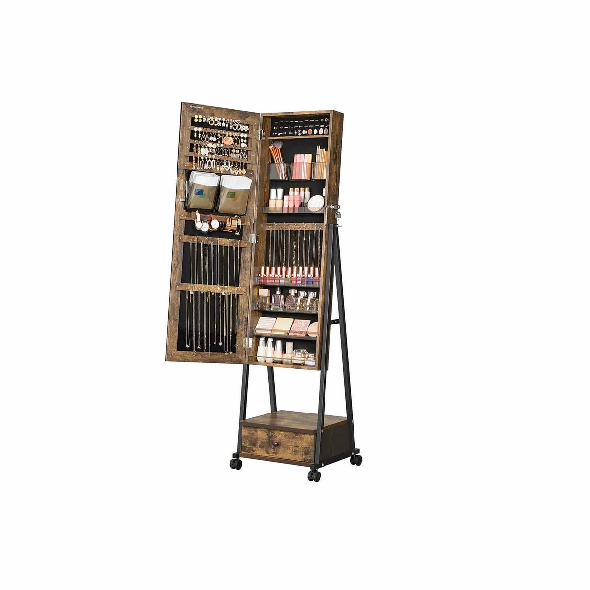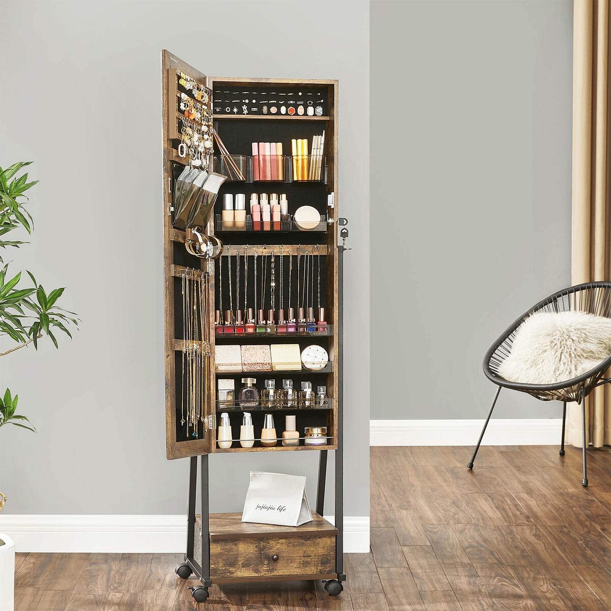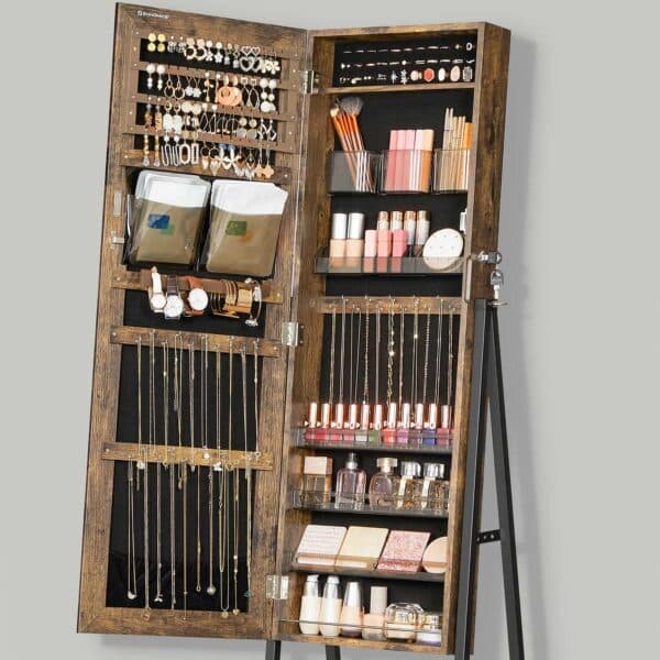 Atsisveikinkite su chaosu! Erdvi spinta, viso ilgio veidrodis, lentyna ir stalčius – šioje funkcionalioje papuošalų spintelėje sutalpinsite viską, ko reikia, kad sutaupytumėte laiko ir vietos. Šio baldo erdvus ir protingas išdėstymas leidžia sutvarkyti daiktus kaip profesionalui.