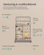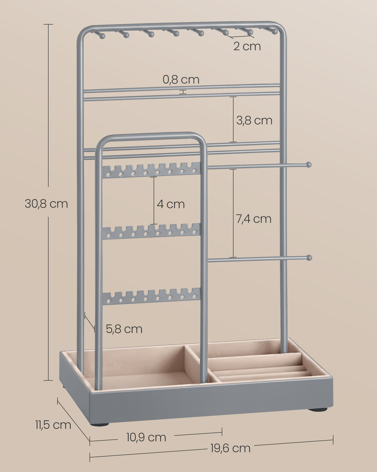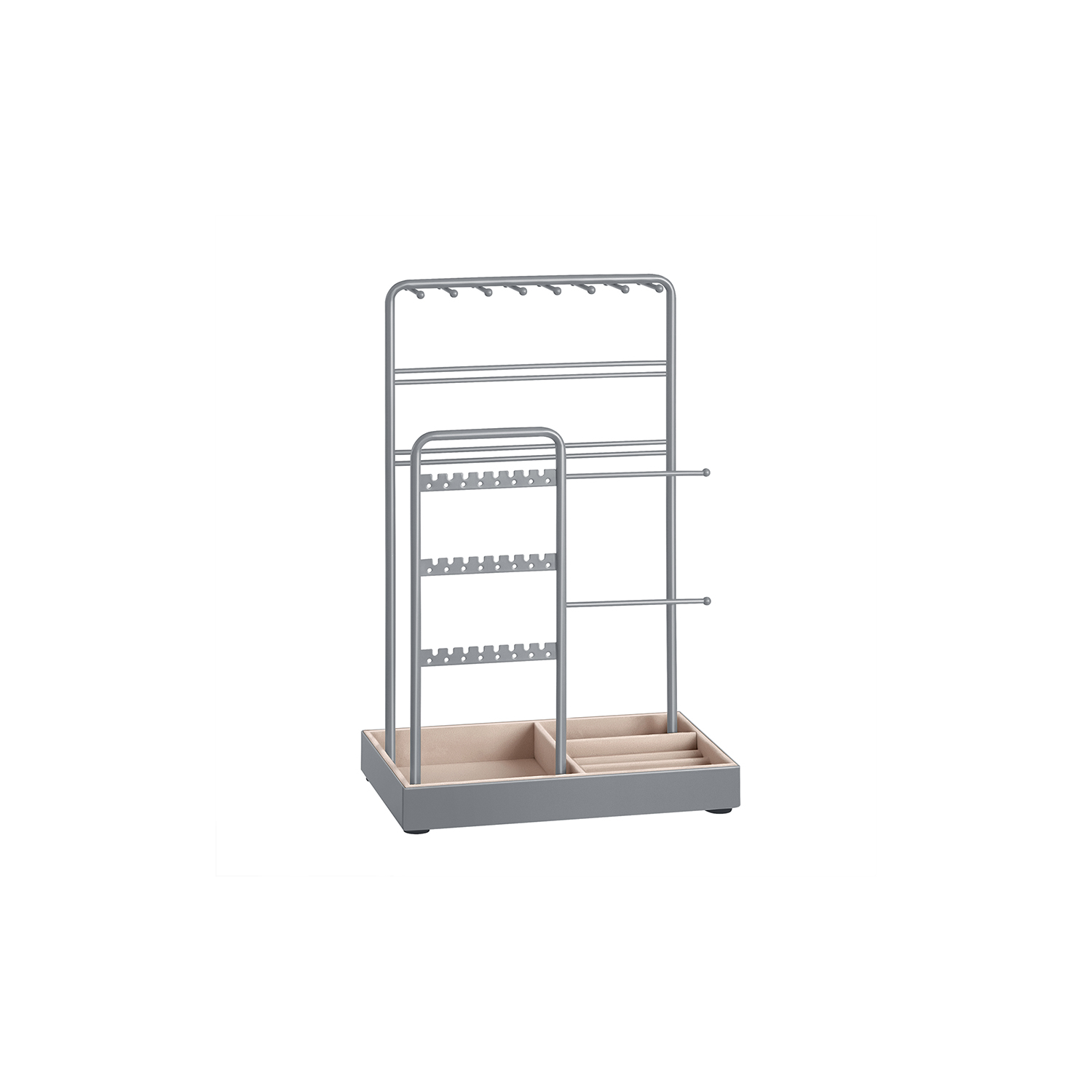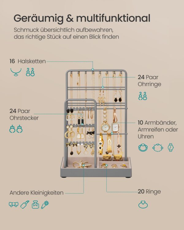 Šis papuošalų stovas yra elegantiškas ir funkcionalus sprendimas jūsų papuošalų laikymui. Jo balandžio pilka spalva suteikia subtilumo ir stiliaus jūsų interjerui.