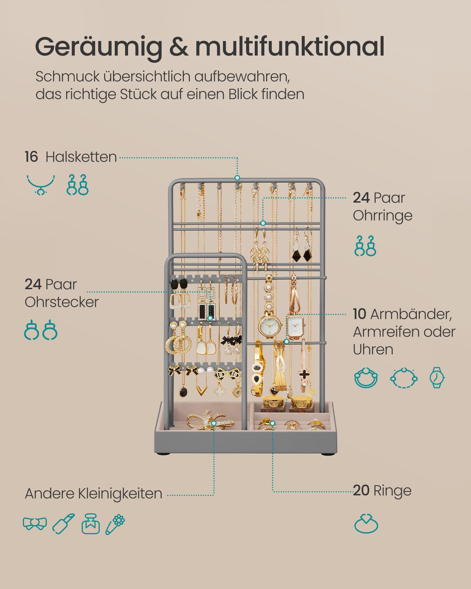 Šis papuošalų stovas puikiai tinka laikyti įvairius papuošalus, tokius kaip žiedai, apyrankės ir karoliai, užtikrinant jų tvarkingą ir saugų laikymą.