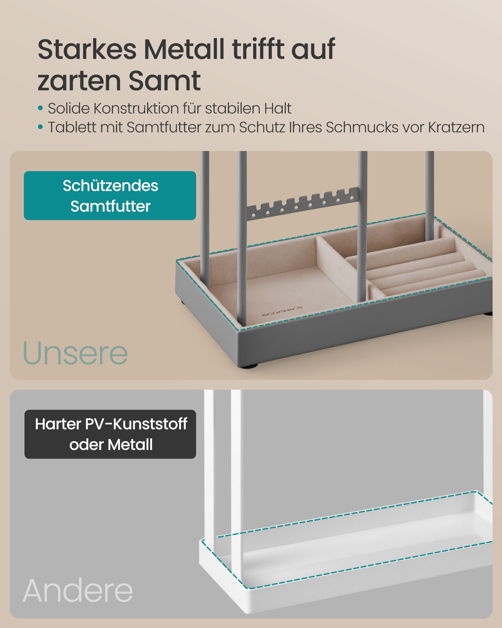 Pagamintas iš aukštos kokybės metalo, MDF (vidutinio tankio medienos plaušų plokštės) ir aksomo, šis stovas yra tvirtas ir ilgaamžis. Jo matmenys yra 11,5 x 19,6 x 30,8 cm (D x P x A), o svoris siekia 0,7 kg.
