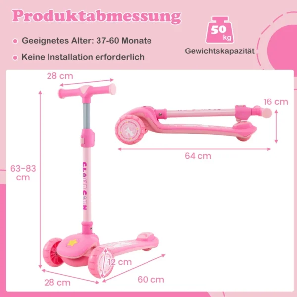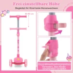 Paspirtukas 60x28x83cm rožinės spalvos yra skirta vaikams nuo 3 iki 5 metų, norintiems lavinti pusiausvyrą ir koordinaciją. Šis sulankstomas paspirtukas pasižymi reguliuojamu vairu, LED apšviestais PU ratais ir saugiu galiniu stabdžiu, todėl yra praktiškas ir patogus naudoti įvairiomis sąlygomis.