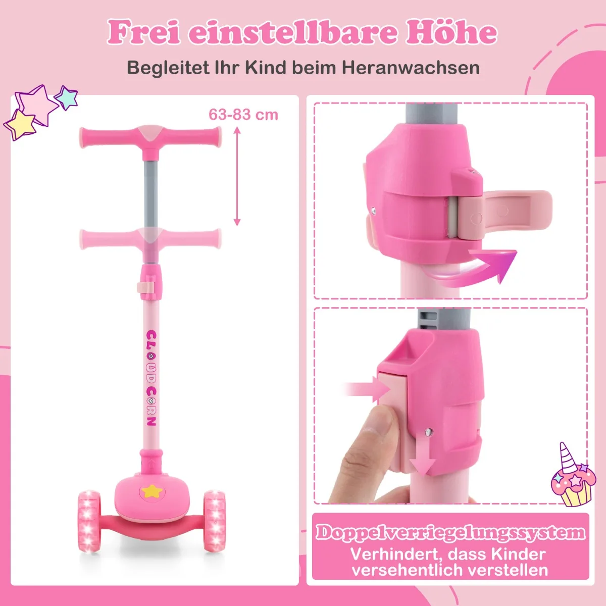 - Reguliuojamas aukštis nuo 60 iki 83 cm, tinkamas įvairaus ūgio vaikams.