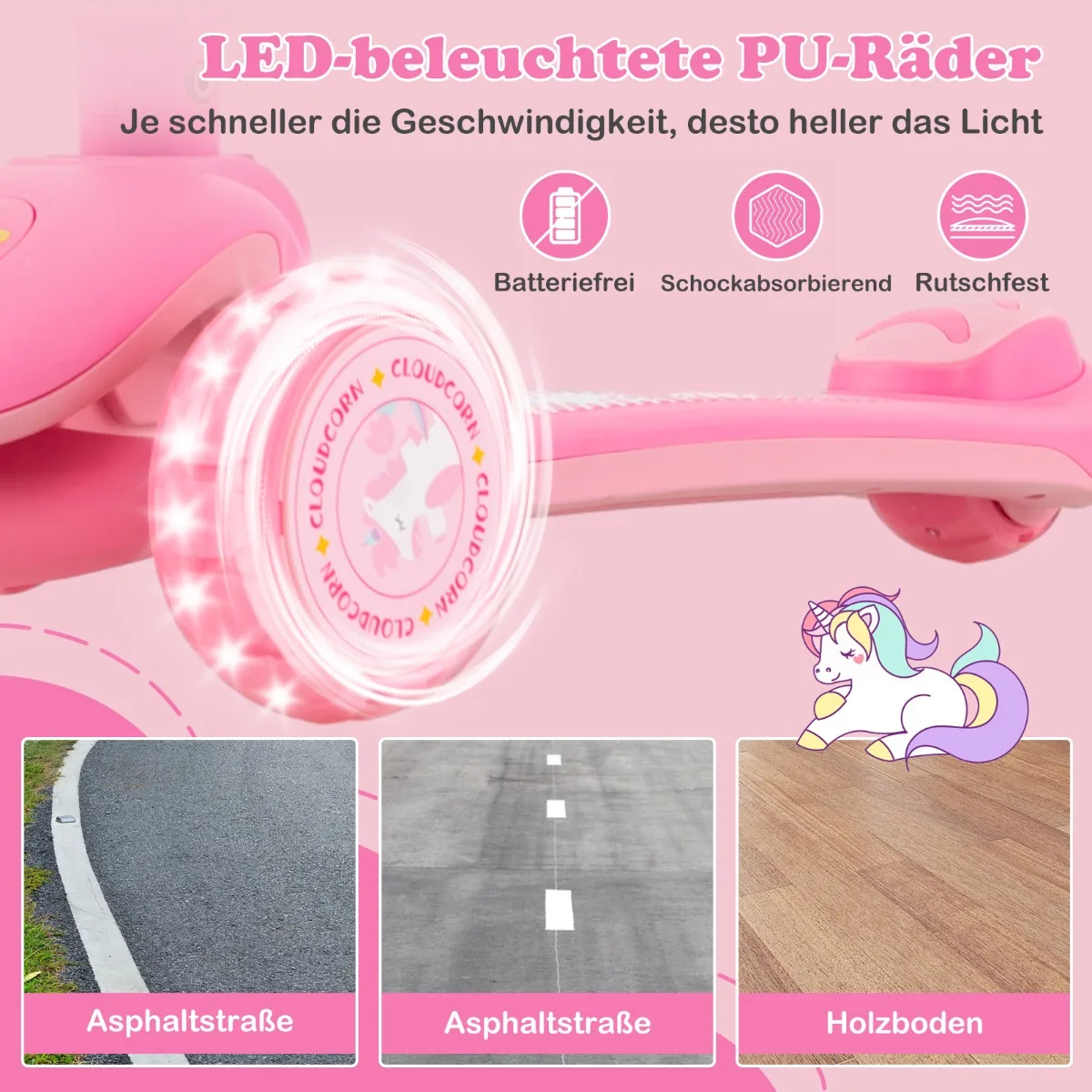 - LED apšviesti 120 mm skersmens PU ratai su ABEC-7 guoliais – apšviečia be baterijų, šviesa stiprėja didėjant greičiui.