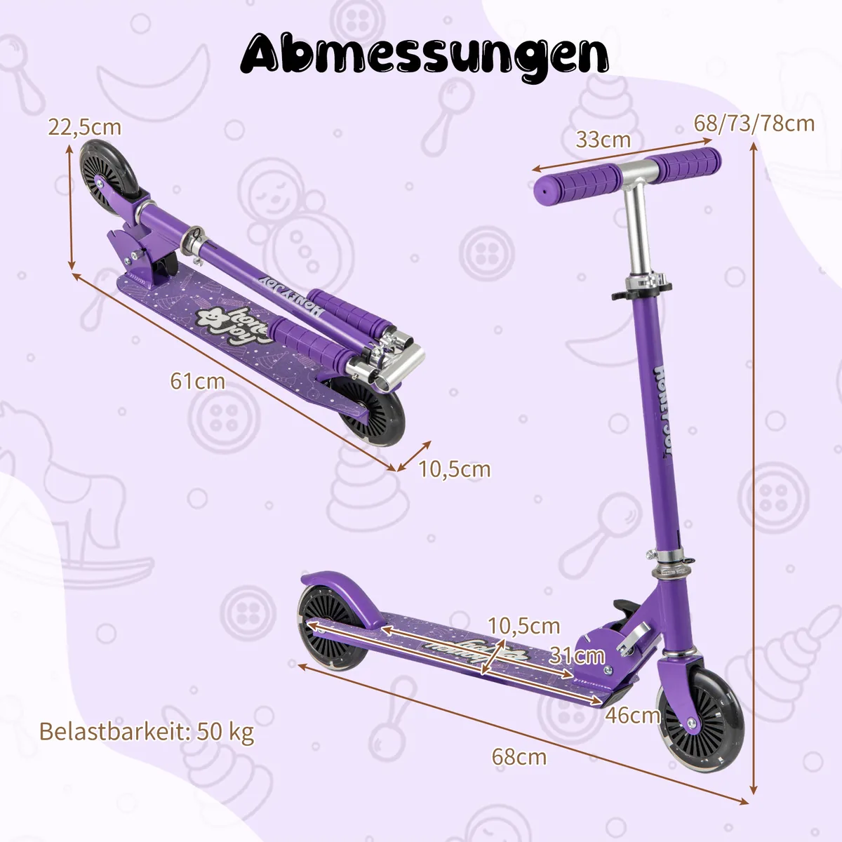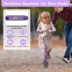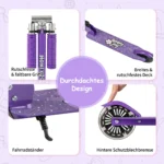 Paspirtukas 68x33x78cm, violetinės spalvos, skirtas vaikams nuo 3 metų, puikiai tinka aktyviam laisvalaikiui ir patogiam judėjimui mieste. Reguliuojamas vairas leidžia pritaikyti paspirtuką prie įvairaus amžiaus vaikų, o šviečiantys LED ratai užtikrina geresnį matomumą ir saugumą tamsoje. Patvari konstrukcija ir sulankstomas dizainas palengvina transportavimą bei laikymą.