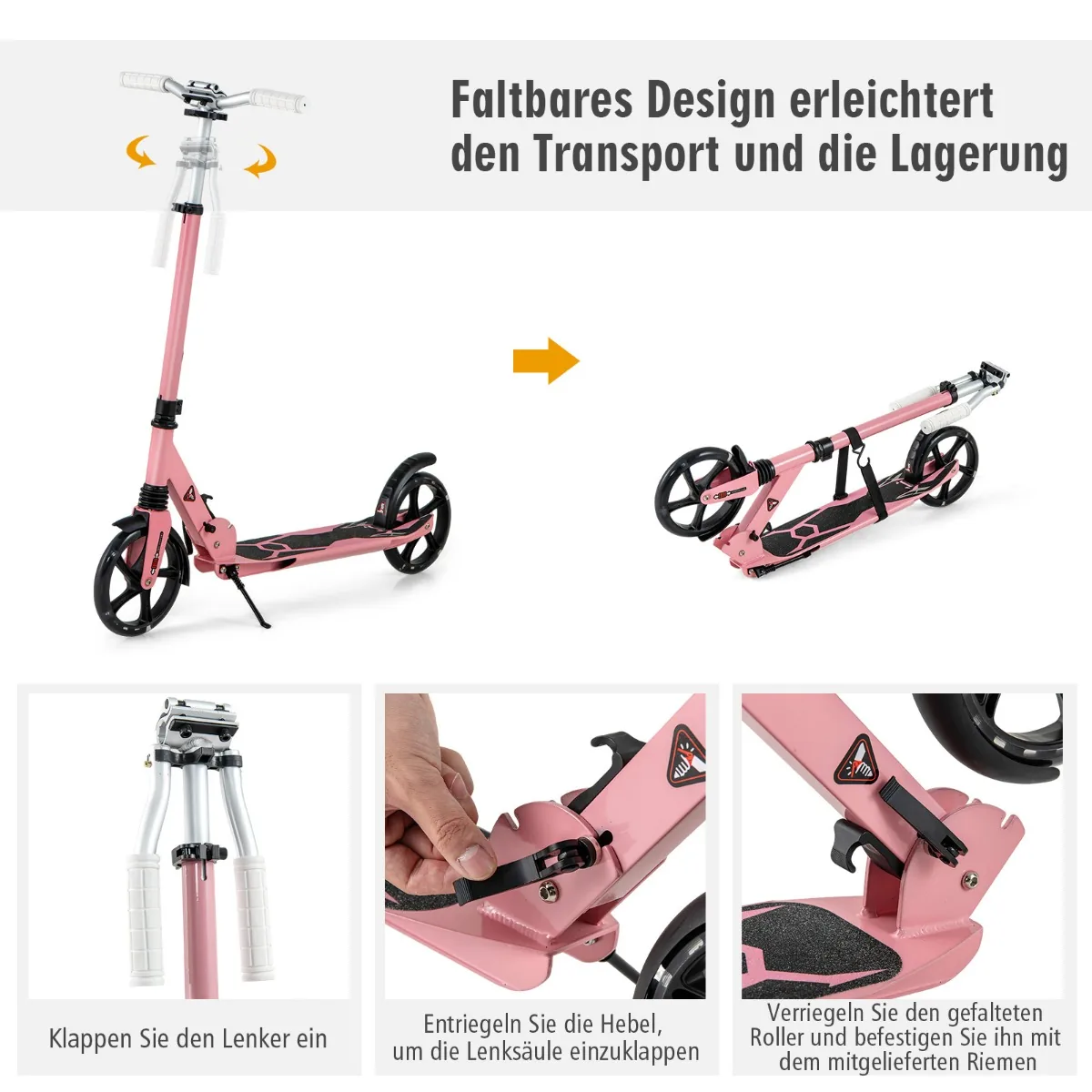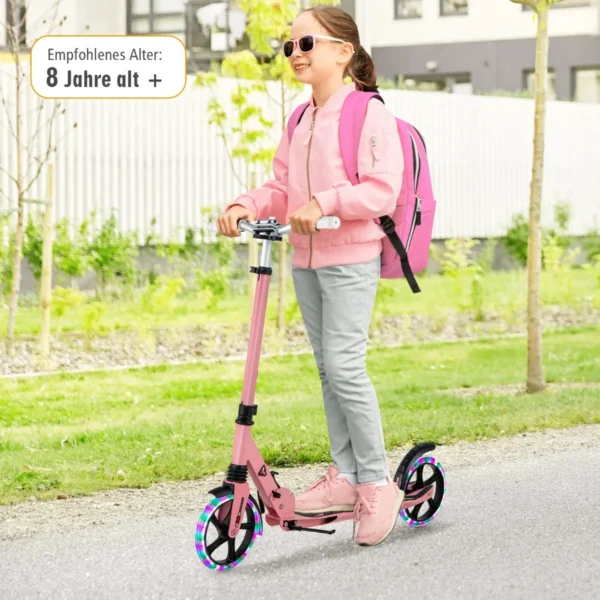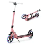 Paspirtukas 93x43x106 cm rožinės spalvos – patogus ir praktiškas pasirinkimas vaikams nuo 8 metų bei suaugusiems. Reguliuojamo aukščio T formos rankena leidžia pritaikyti paspirtuką skirtingo ūgio naudotojams, o tvirti PU ratai užtikrina tylų ir sklandų važiavimą įvairiais paviršiais.
