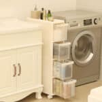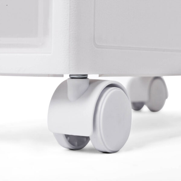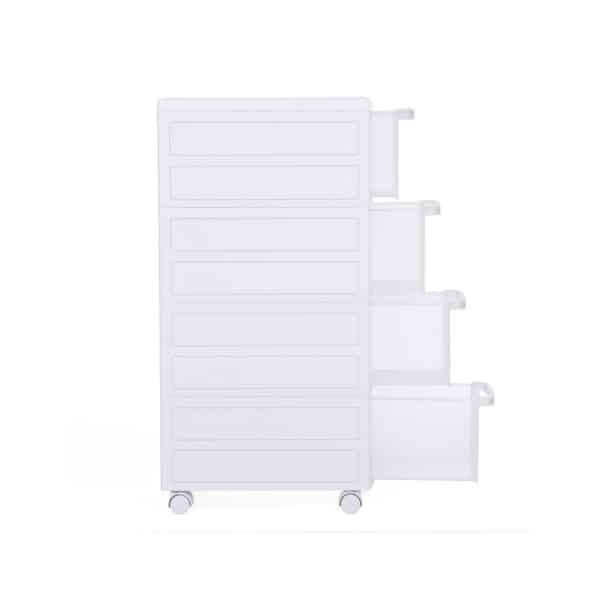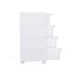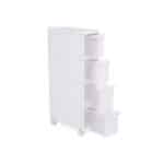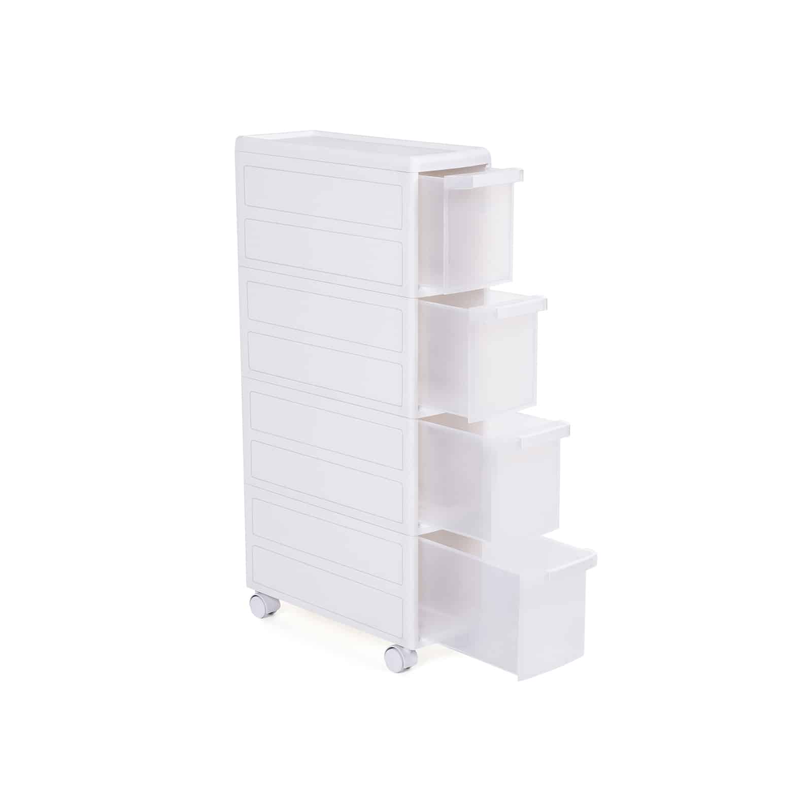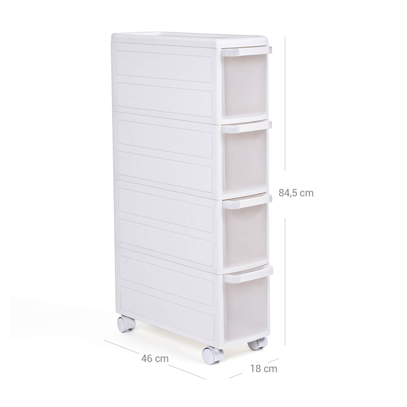 Lengvai prižiūrima baltos spalvos nišinė lentyna iš PP plastiko su 4 stalčiais yra labai praktiškas sprendimas siaurose ir kompaktiškose virtuvėse ar vonios kambariuose! Dėl peršviečiamų stalčių nesunkiai matosi, kas yra viduje, o jei į vidų išsilietų prieskoniai ar kiti skysčiai, jie neišsiteps ir neištekės ant grindų ar apatinių skyrių. Dėmes lengvai ir greitai nuplausite vandeniu. Pridedamas papildomas dangtelis, todėl lentyną galite atskirti į 2 dalis ir jas naudoti atskirai. Stalčių skaičius taip pat gali būti derinamas pagal pageidavimą.