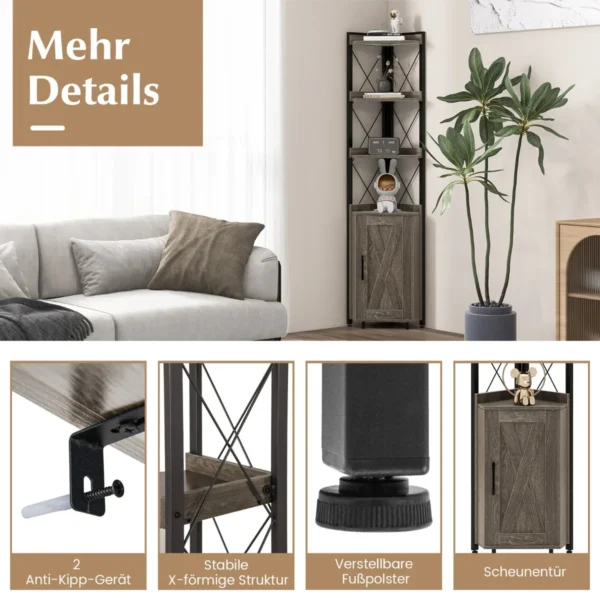 - Lentyna turi keturias atviras lentynas ir vieną spintelę su durelėmis, suteikiančią papildomą saugojimo vietą.
