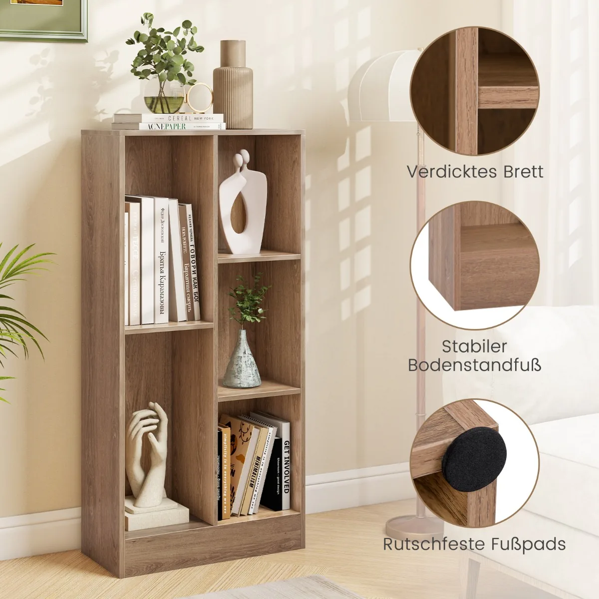 Pastatoma lentyna 50x24x104 cm, rudos spalvos, siūlo funkcionalią erdvę knygoms ir daiktams laikyti. Penki atviri skyriai leidžia patogiai organizuoti įvairius namų reikmenis ar dekoracijas. Pagaminta iš medienos pagrindo plokštės ir MDF, lentyna užtikrina tvirtumą ir stabilumą kasdieniam naudojimui.