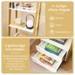 - Keturių aukštų atviros lentynos padeda išlaikyti tvarką ir patogiai išdėstyti knygas bei dekoracijas.
