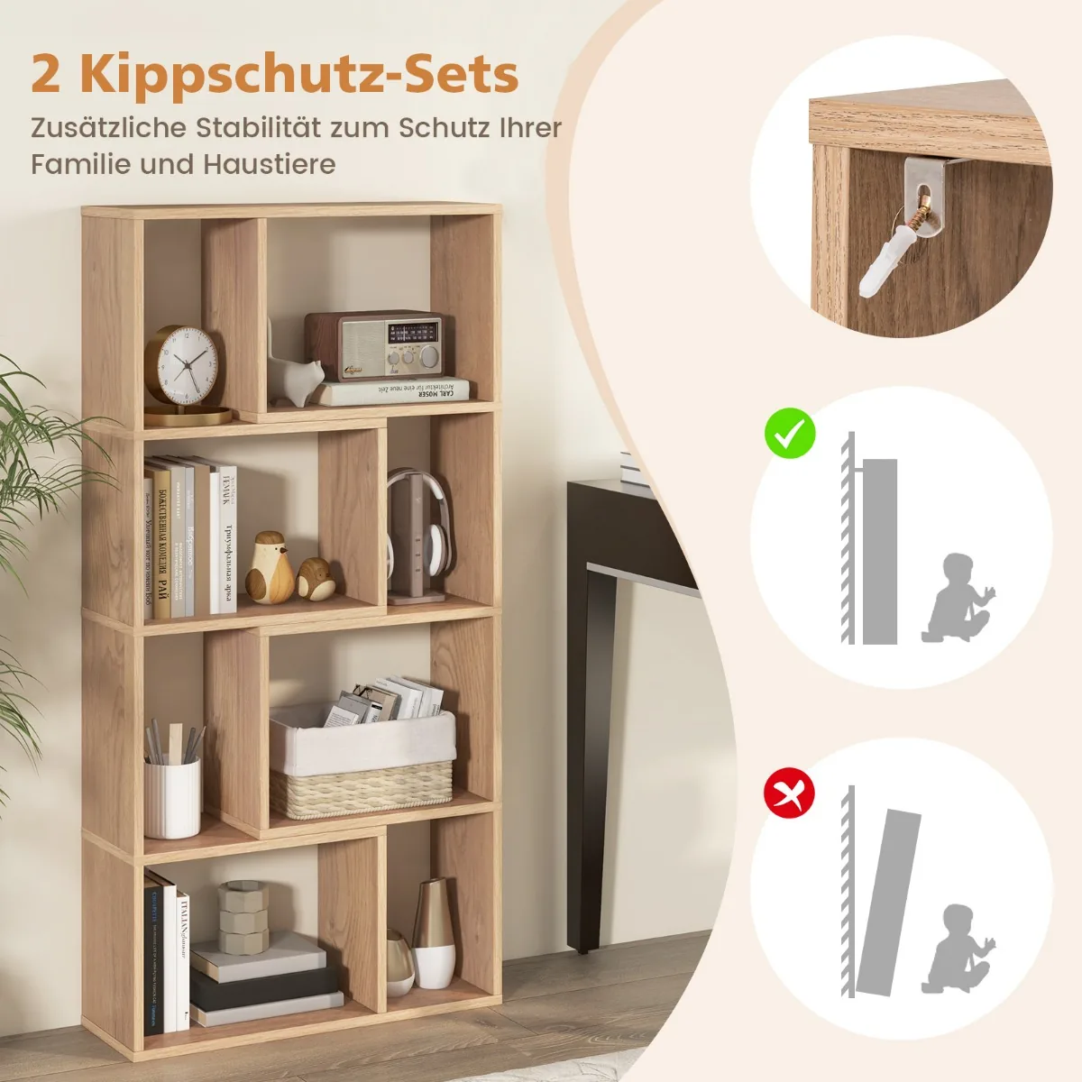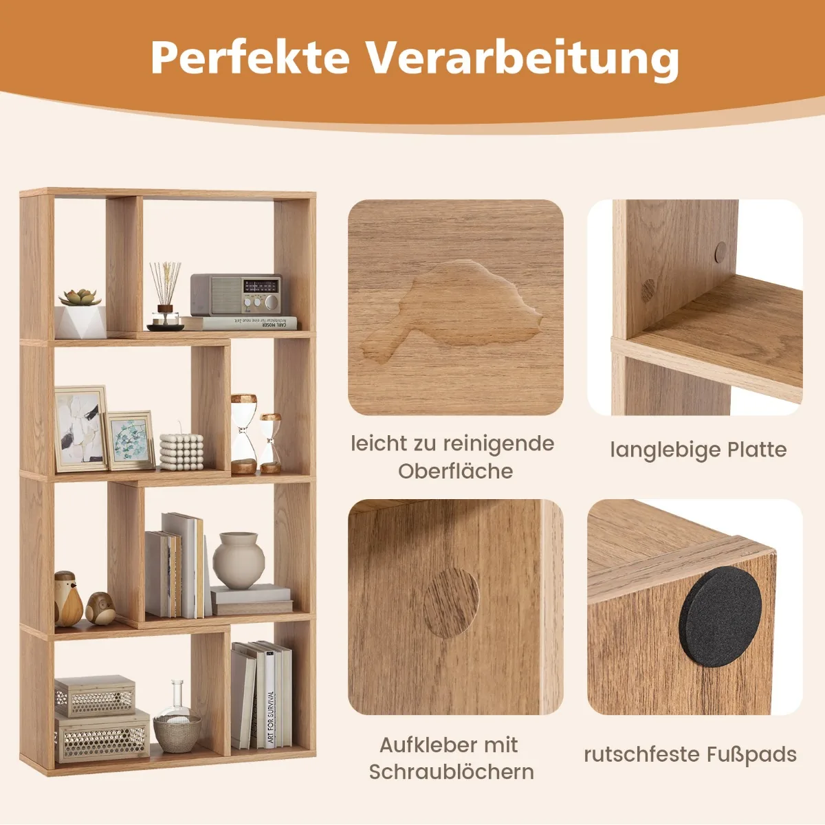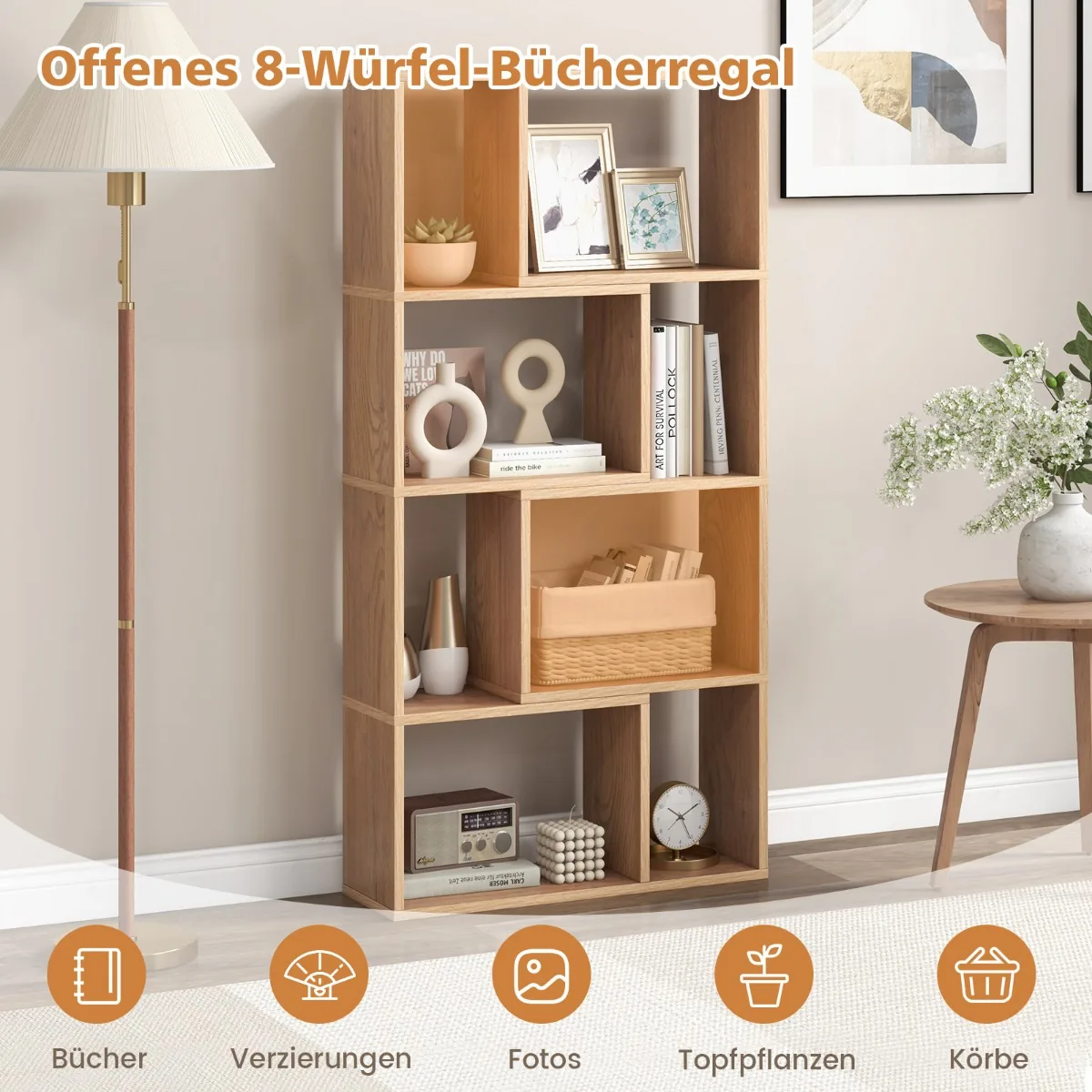 - 8 atviri skyriai leidžia patogiai laikyti knygas, kolekcijas, augalus ar kitus daiktus.
