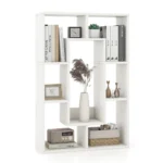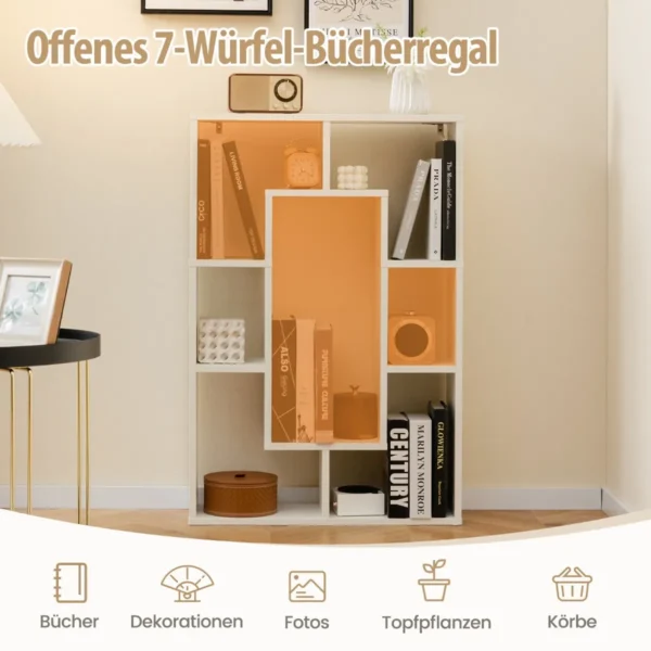 - Geometrinė knygų lentyna su 7 skyriais, suteikianti daug vietos knygoms ir daiktams.