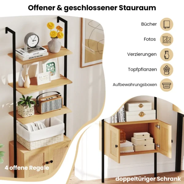 - Sujungia atviras lentynas ir uždarą spintelę, suteikdama pakankamai vietos knygoms, dekoratyviniams daiktams ar kitiems daiktams.