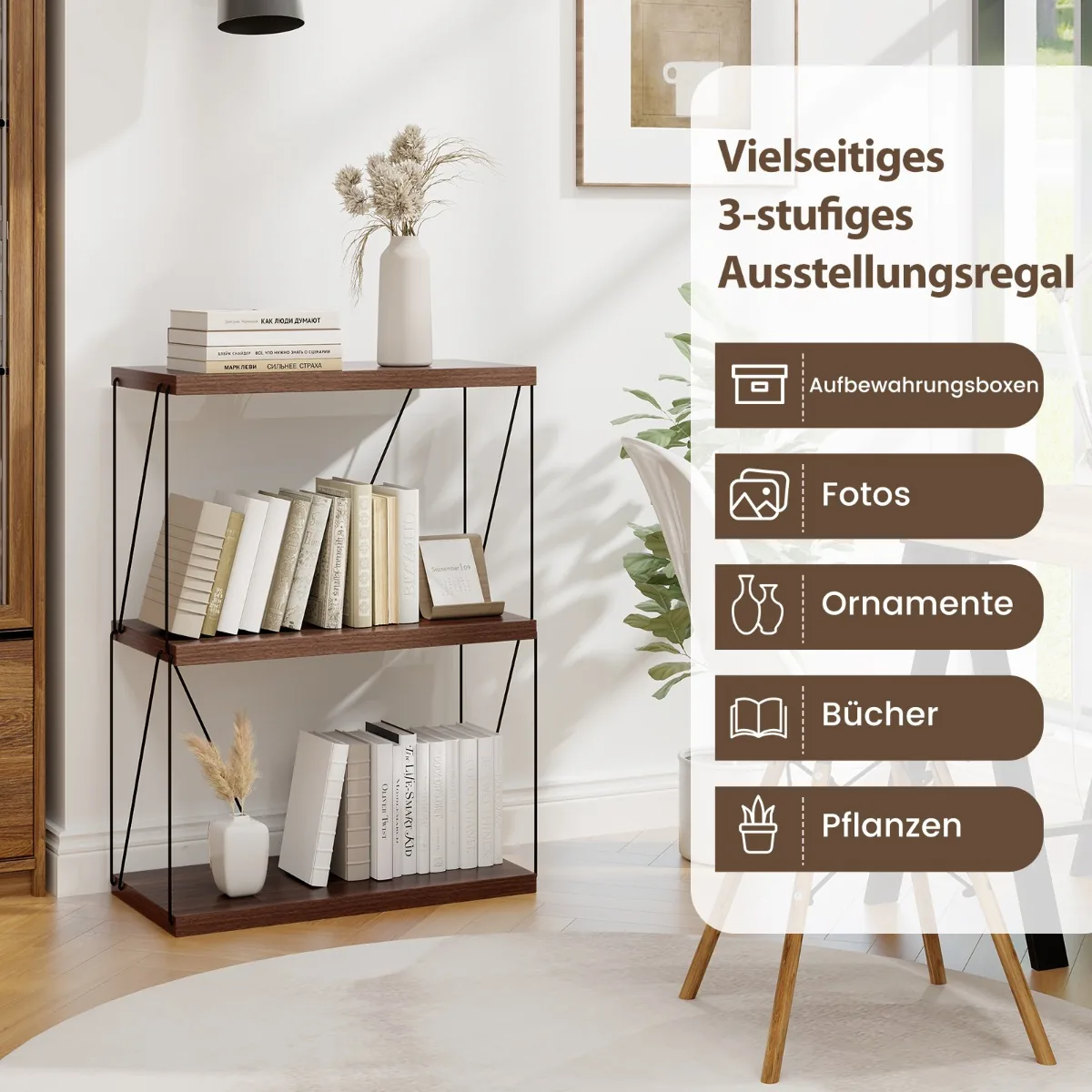 Pastatoma lentyna 61×29,5×82 cm, rudos ir juodos spalvos, puikiai tinka organizuoti jūsų erdvę. Ši 3 pakopų lentyna su metaliniu rėmu ir MDF lentomis pasižymi praktiškumu ir erdvės taupymu, tinka knygoms, dekoracijoms ar mažiems daiktams laikyti.