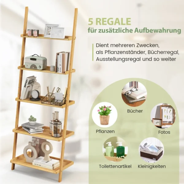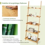 Pastatoma lentyna 65x36x183cm šviesiai rudos spalvos – praktiškas sprendimas namų erdvės organizavimui. Ši penkių pakopų lentyna pagaminta iš natūralaus bambuko, kuris užtikrina ilgaamžiškumą ir stabilumą. Dėl kompaktiškų matmenų lentyna puikiai tinka kampuose ir gali būti pritaikyta įvairiems daiktams laikyti.