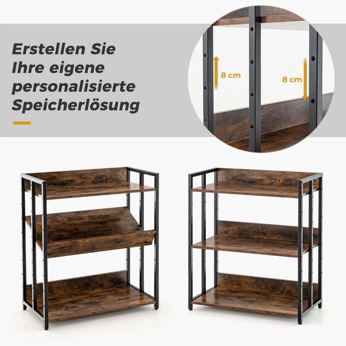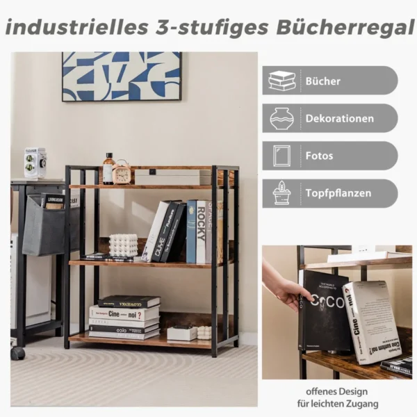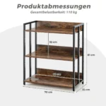 Pastatoma lentyna 70x35x81 cm, rudos ir juodos spalvos, yra praktiškas sprendimas namų ar biuro erdvei organizuoti. Trys atviros lentynos suteikia pakankamai vietos knygoms, dekoracijoms bei kitų daiktų laikymui. Metalinis rėmas ir storos dirbtinės medienos plokštės užtikrina tvirtumą bei stabilumą.