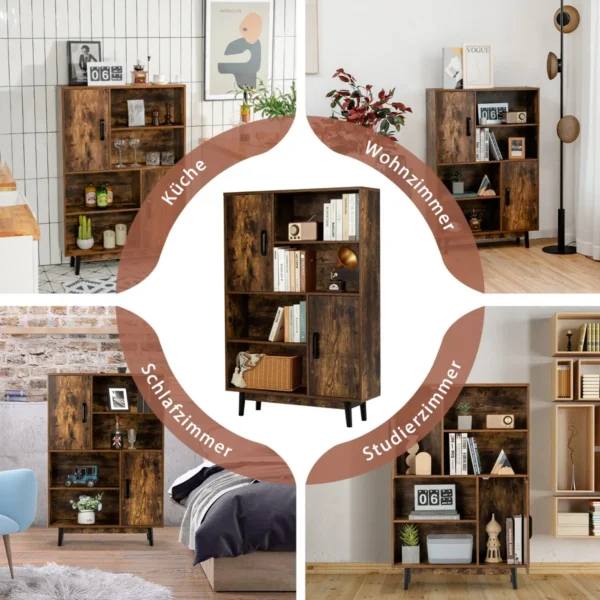 - Talpi knygų lentyna su atviromis lentynomis ir dviem durimis įvairių daiktų laikymui.