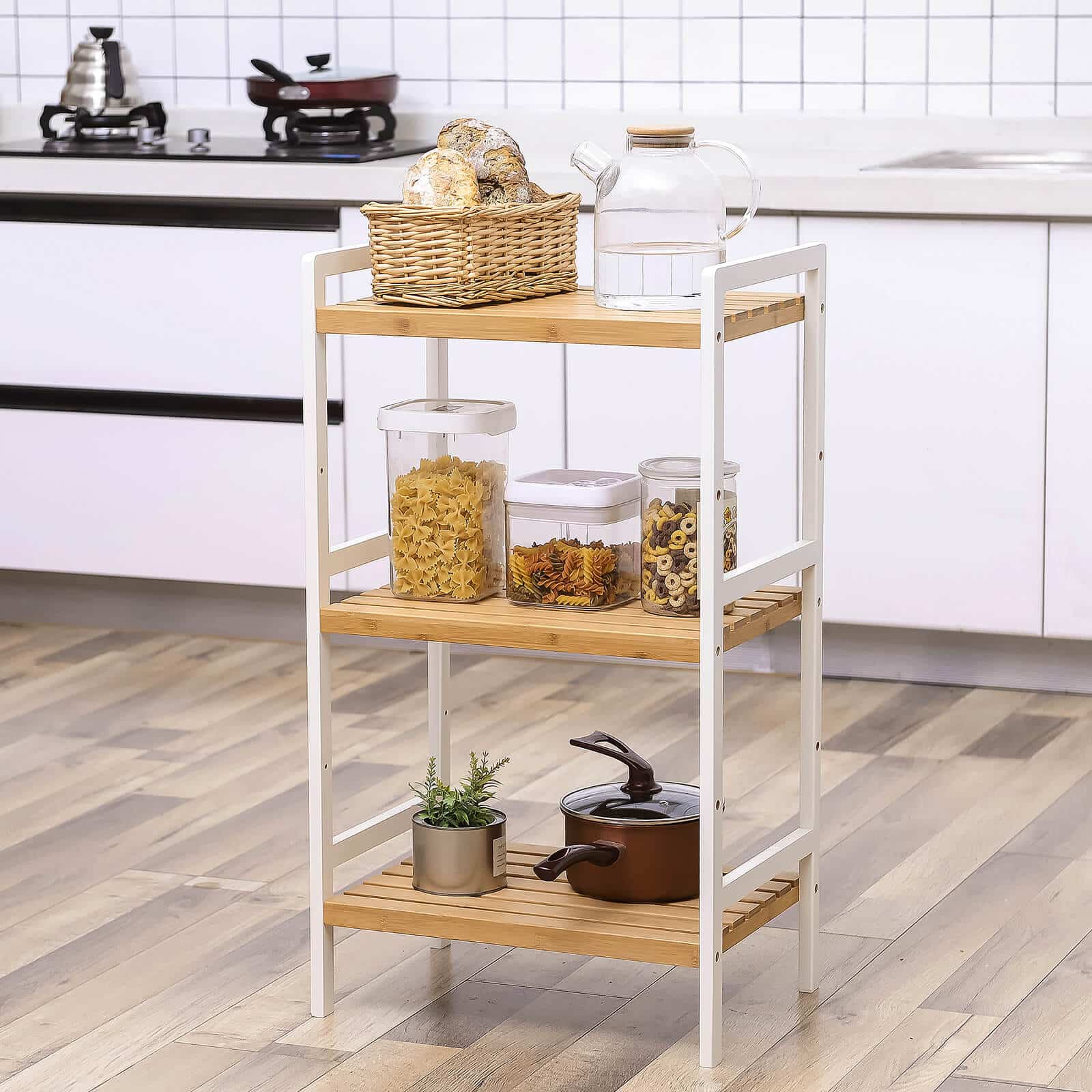 Tvarkos magija! Ši pastatoma lentyna iš bambuko, baltos spalvos, padės sutvarkyti visus jūsų daiktus miegamajame, vonios kambaryje, virtuvėje, persirengimo kambaryje ar koridoriuje. Jos dizainas ir spalvų derinys visada traukia akį.