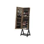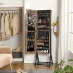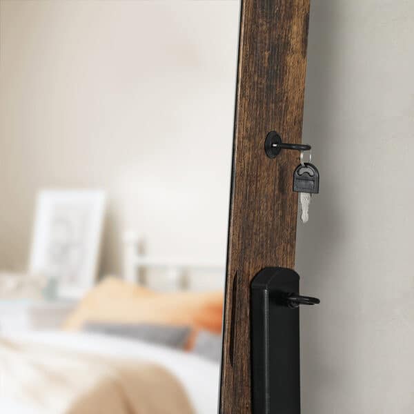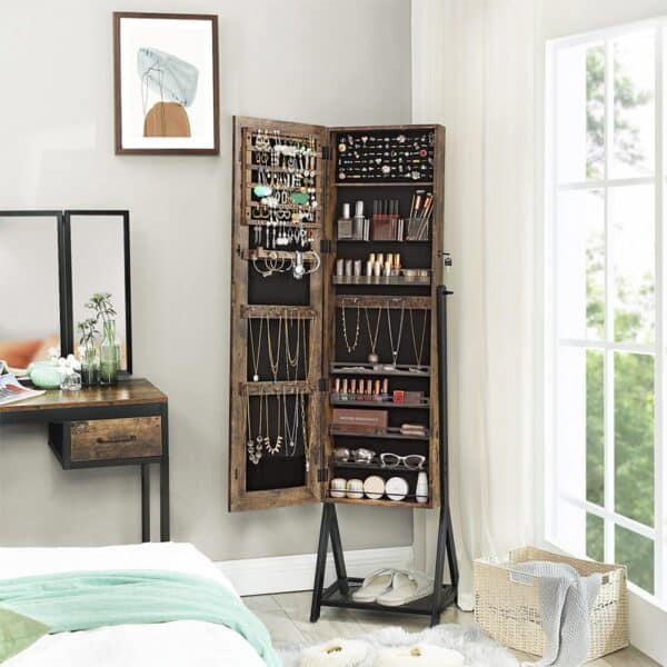 - Pakreipta papuošalų spintelė su dideliu berėmiu veidrodžiu