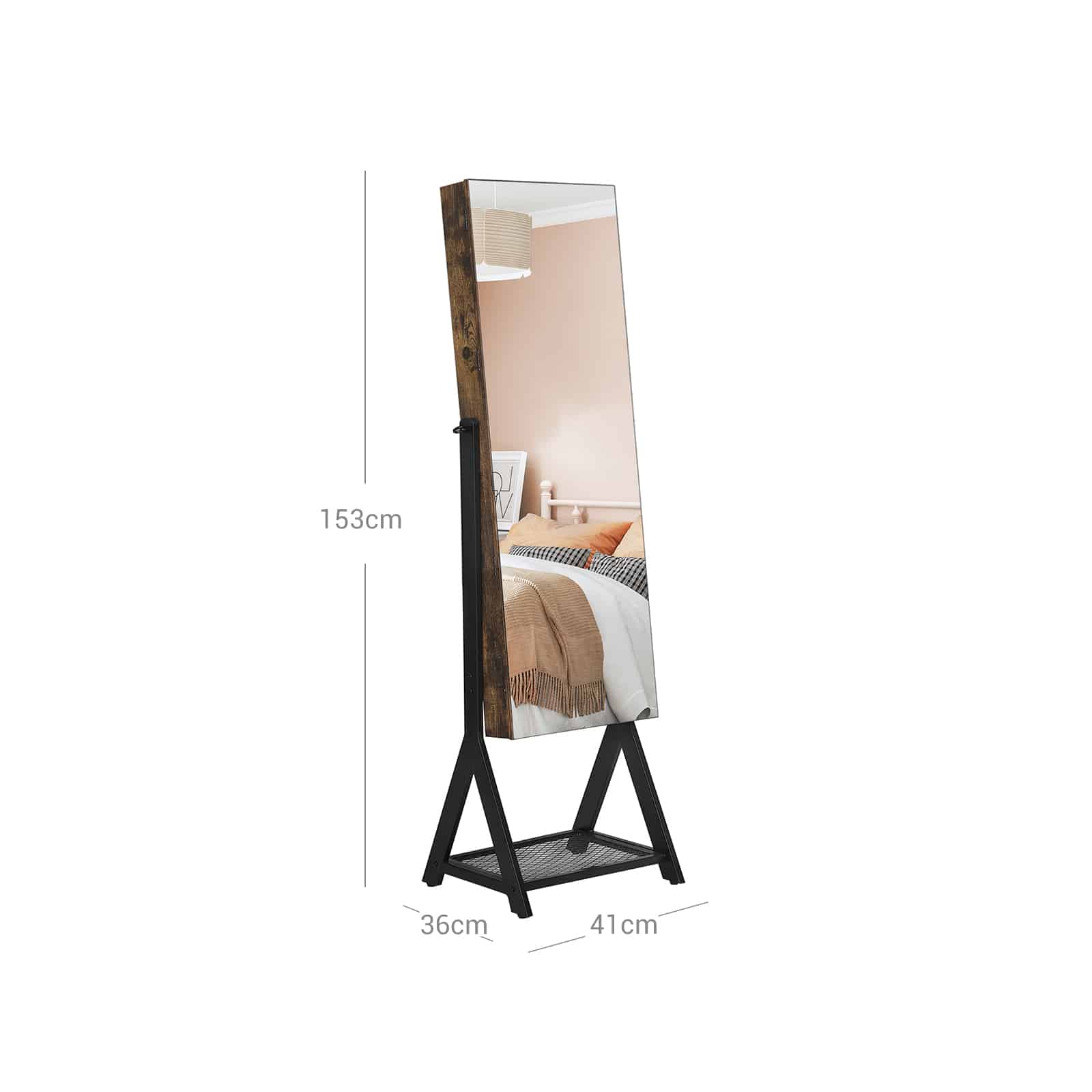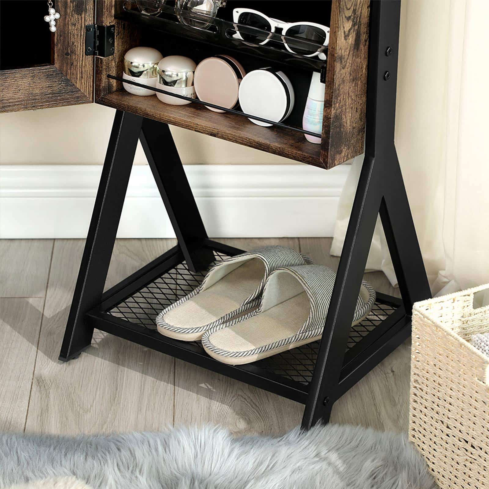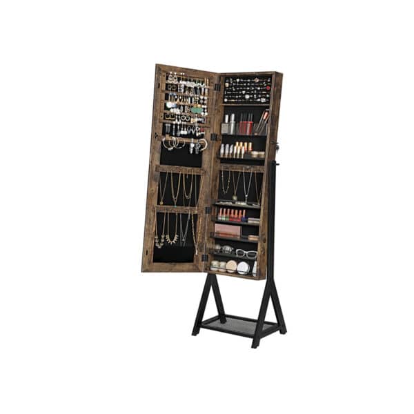 Daugiau funkcijų, daugiau emocijų! Ši pastatoma papuošalų spintelė JJC97BC suteikia daugybę laikymo galimybių, kurios tikrai nustebins. Dėl tinklelio lentynos jums nereikės dėti krepšių ant grindų, o tai tikrai nudžiugins. Žiūrėkite savo aprangą nuo viršaus iki apačios viso ilgio veidrodyje. Visos jūsų draugės jums pavydės, nes jos taip pat norės šio veidrodžio!