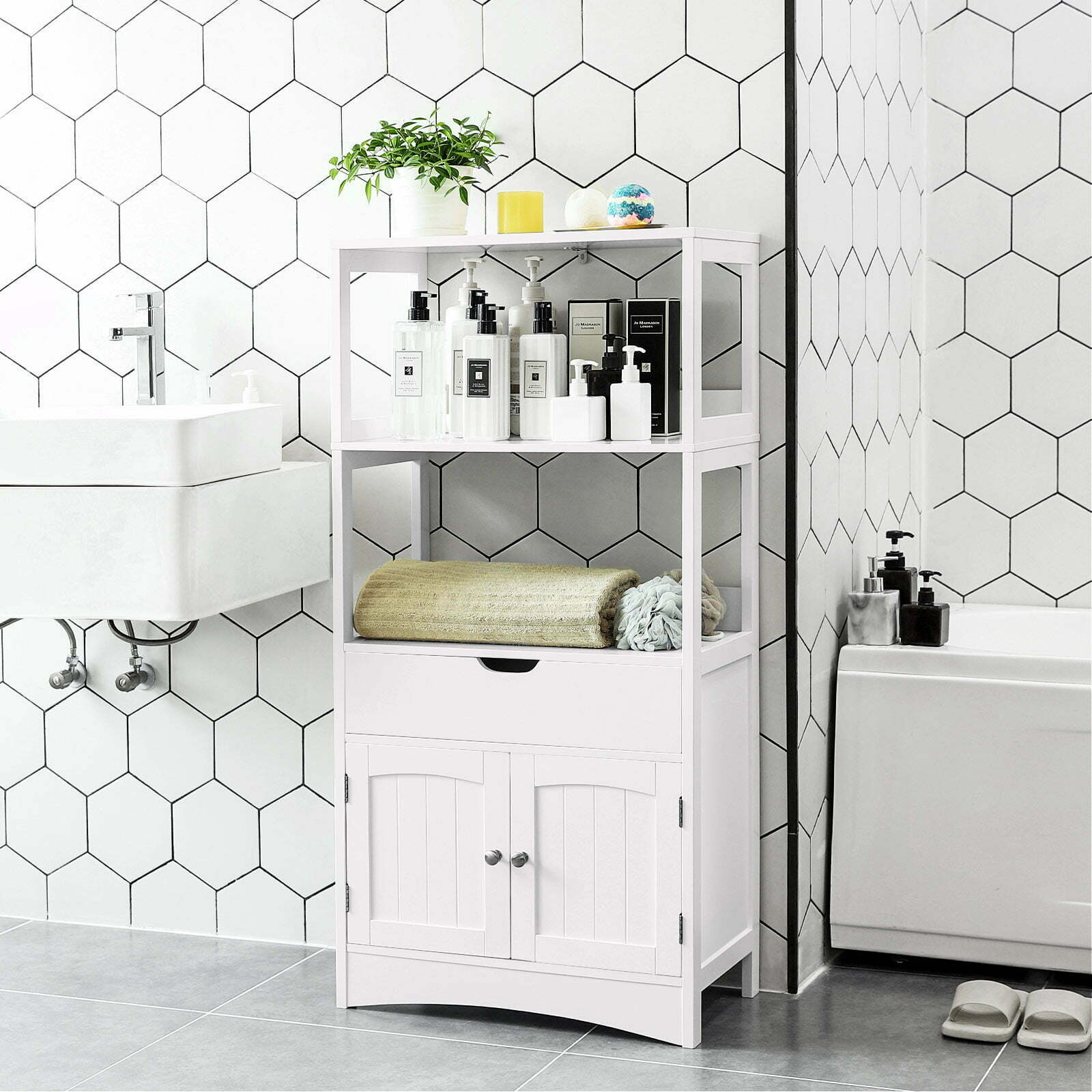 Įvairios laikymo galimybės: atviruose skyriuose galite lengvai pasiekti dažnai naudojamus vonios reikmenis. Stalčiuje yra vietos rankšluosčiams. Už spintos durų galite paslėpti valymo priemones, tualetinį popierių ir pan. Ant viršutinės lentynos uždėkite kvapnią žvakę ir suteikite vonios kambariui romantišką atmosferą.