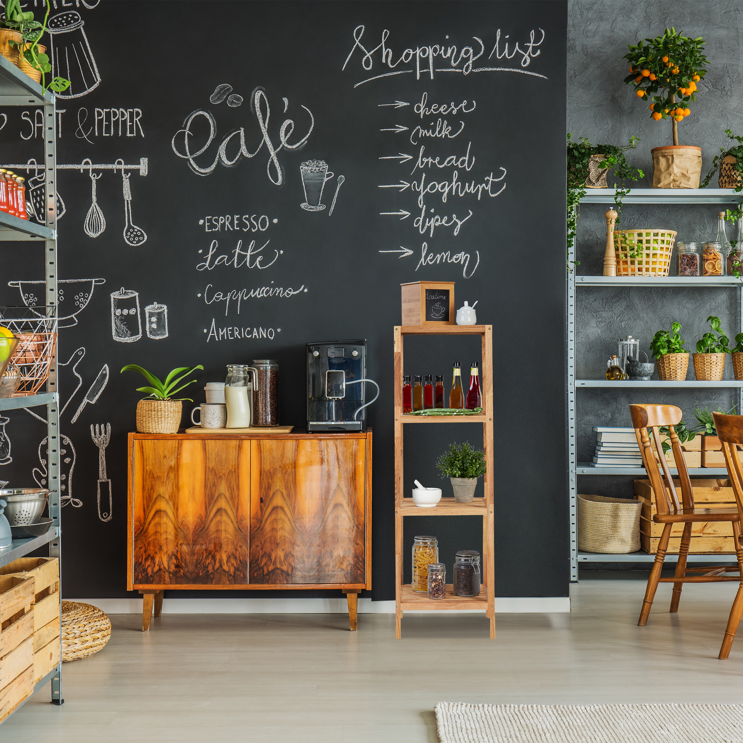 Universalumas: 4 erdvios lentynos suteikia pakankamai vietos įvairiems indams, virtuvės reikmenims ir žolelių puodams laikyti.