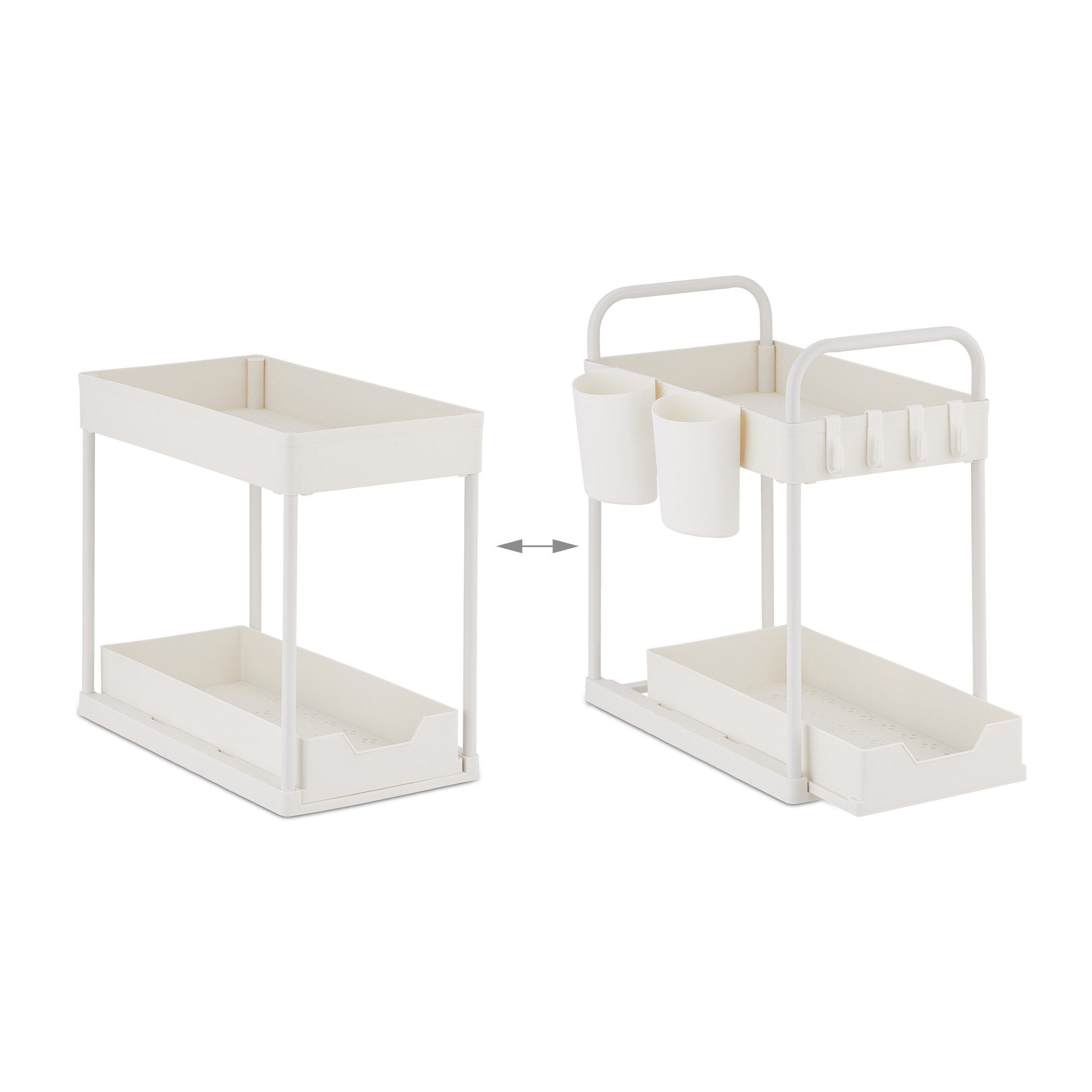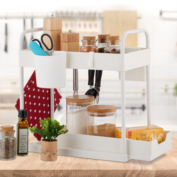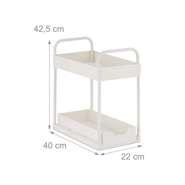 - Dviejų lygių dizainas: Suteikia daug vietos įvairiems daiktams, tokiems kaip valymo priemonės, vonios reikmenys ir kt.