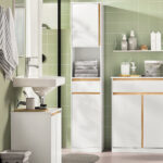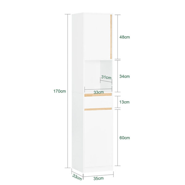 Šis pastatomas vonios spintelė, kurios matmenys yra 35x33x170 cm, yra puikus pasirinkimas jūsų vonios kambariui. Baltos ir šviesiai rudos spalvos derinys suteikia elegancijos ir šiuolaikiškumo jūsų interjerui.