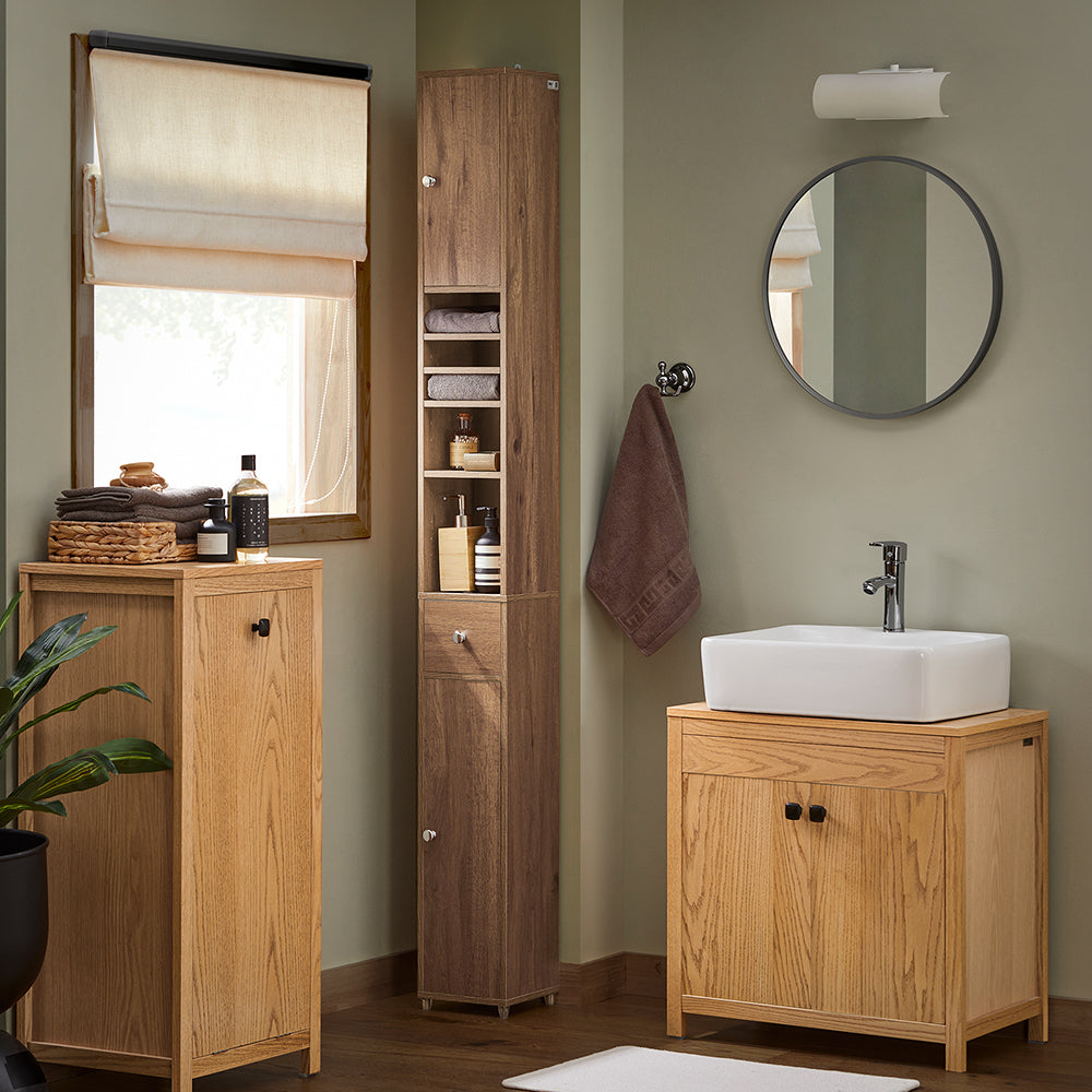 Ši pastatoma vonios spintelė 20x20x180 cm, rudos/sidabrinės spalvos, suteiks jūsų vonios kambariui stilingą išvaizdą ir modernią atmosferą. Jos subtilus ir elegantiškas dizainas puikiai tinka bet kokiam vonios kambariui.