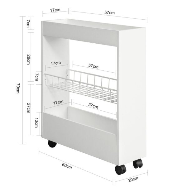 Ši pastatoma vonios spintelė 20x60x70 cm, baltos/juodos spalvos, yra puikus sprendimas jūsų vonios kambario organizavimui. Jos tvirta konstrukcija ir keturi ratukai leidžia lengvai perkelti spintelę ten, kur jums reikia, net ir mažuose erdvėse.