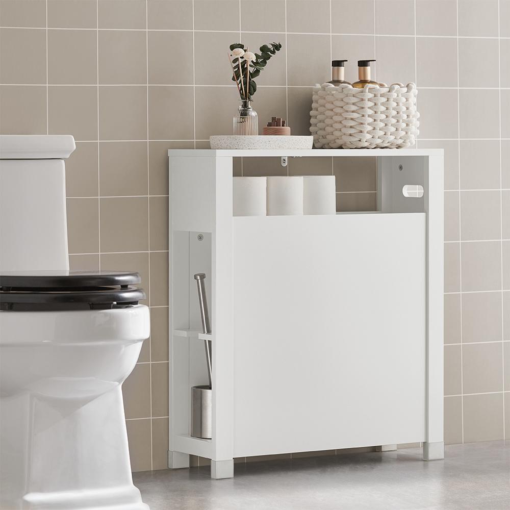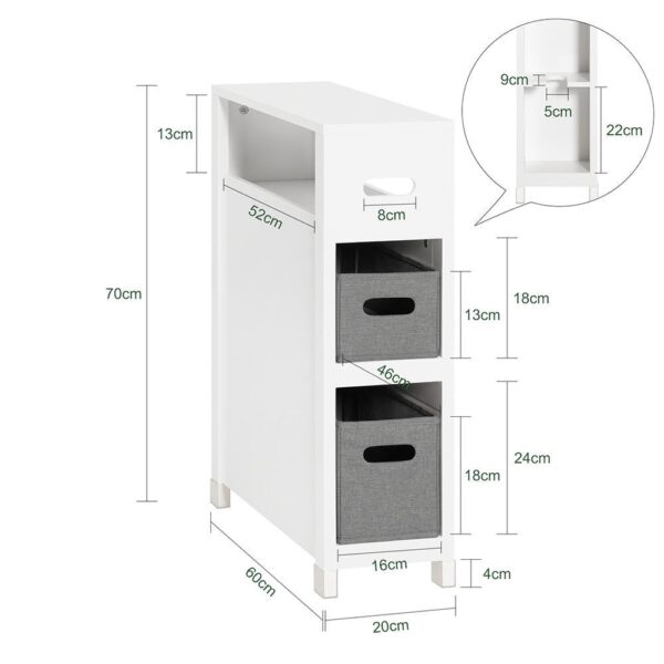 Ši pastatoma vonios spintelė 20x60x70 cm, baltos/pilkos spalvos, yra puikus sprendimas jūsų vonios kambariui. Dėl savo siauro dizaino ji puikiai tinka tarp tualeto ir vonios, suteikdama papildomos vietos daiktams laikyti.