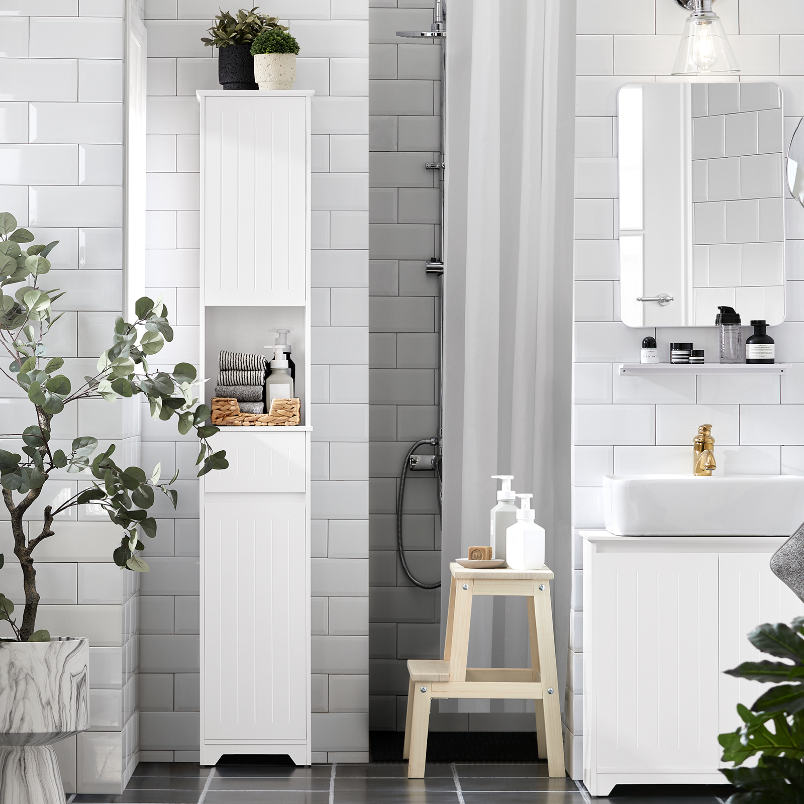 Ši pastatoma vonios spintelė 30x30x170 cm, baltos spalvos, suteiks jūsų vonios kambariui stilingą išvaizdą ir modernią atmosferą. Jos subtilus ir elegantiškas dizainas puikiai tinka bet kokiam vonios kambariui.