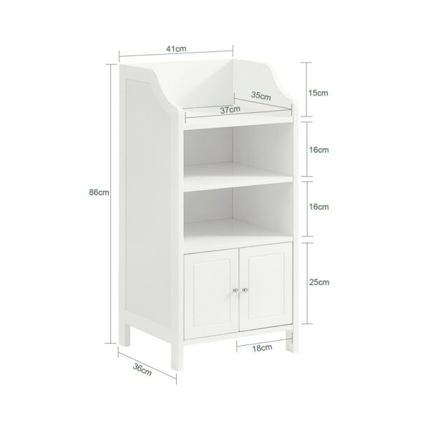 Ši pastatoma vonios spintelė 41x36x86 cm, baltos spalvos, suteikia įvairias laikymo galimybes ir papildomą erdvę jūsų vonios kambaryje. Jos švarios linijos ir elegantiškas dizainas puikiai dera su bet kokiu interjeru.