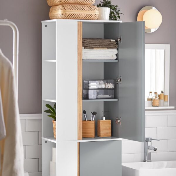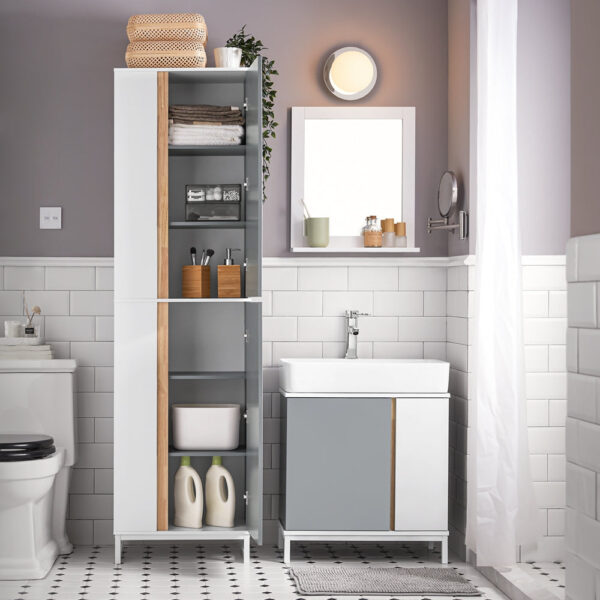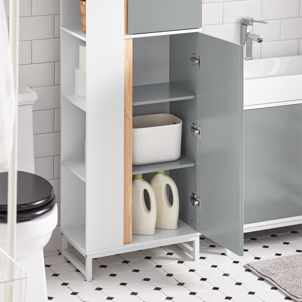 Ši vonios spintelė turi 1 atvirą skyrių ir 2 spinteles su durimis, suteikiančias daug vietos jūsų daiktams laikyti. Be to, spintelė turi apgalvotą dizainą, kuris apsaugo nuo apvirtimo, todėl netyčia užkliuvus, ji nesukels pavojaus.