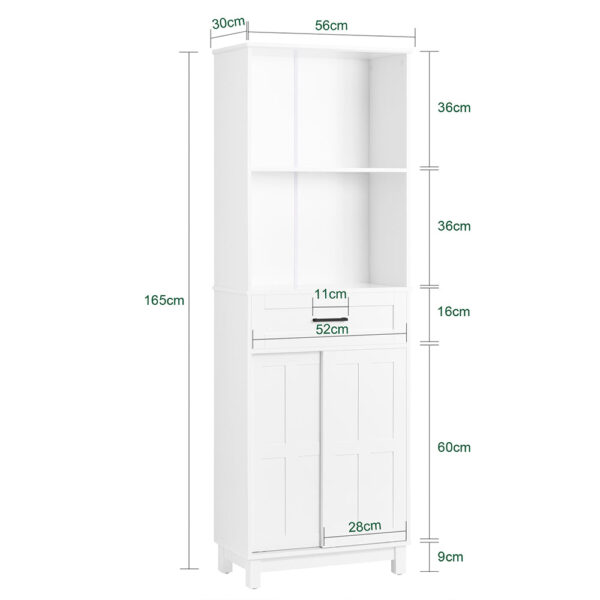 Ši pastatoma vonios spintelė 56x30x165 cm, baltos spalvos, yra puikus sprendimas jūsų vonios kambario ar virtuvės organizavimui. Pagaminta iš aukštos kokybės MDF plokščių, ši spintelė yra tvirta ir ilgaamžė. Jos paviršius yra baltai lakuotas, lygus, atsparus vandeniui ir lengvai valomas.