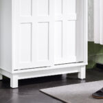 Balta spintelės spalva suteikia elegantišką ir minimalistinį įvaizdį. Vienos spalvos baltumą subalansuoja sidabriniai metaliniai rankenėlės ir lygios, meniškos linijos ant durų, suteikiančios spintai vintažinio stiliaus akcentą.