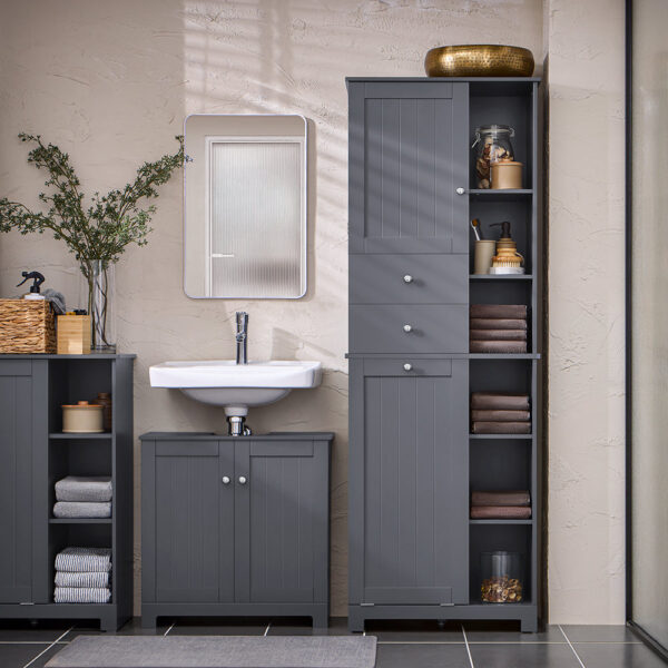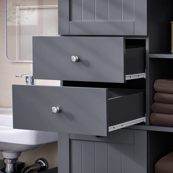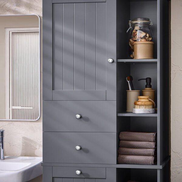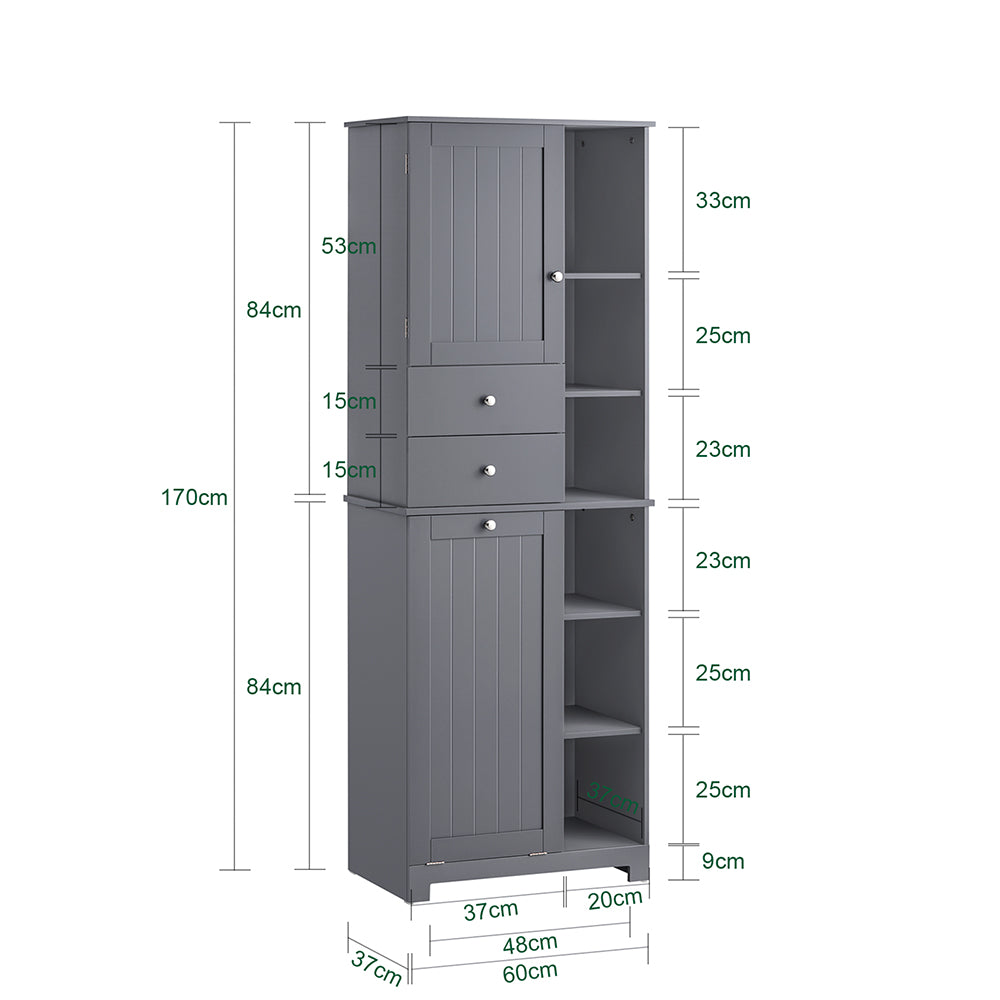 Ši pastatoma vonios spintelė 60x37x170 cm, tamsiai pilkos/sidabrinės spalvos, yra puikus sprendimas optimizuoti jūsų vonios kambario laikymo erdvę. Jos siauras dizainas su giliomis spintelėmis leidžia efektyviai išnaudoti erdvę, neužimant daug grindų ploto.