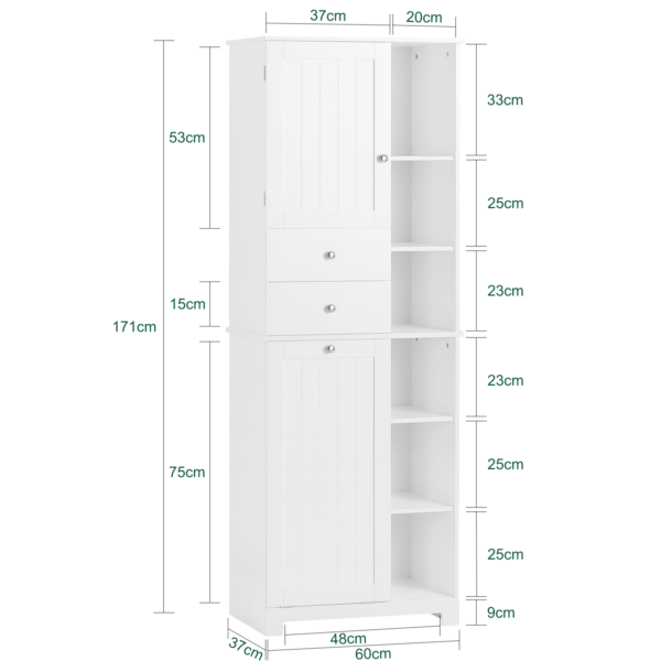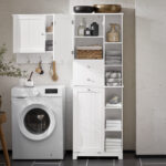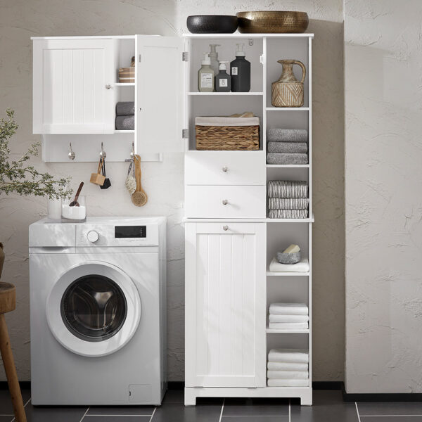 Ši pastatoma vonios spintelė 60x37x171 cm, baltos/sidabrinės spalvos, suteikia pakankamai laikymo vietos, neužimdama daug vietos jūsų vonios kambaryje. Jos siaura konstrukcija su giliomis spintelėmis yra puikus sprendimas, jei norite optimizuoti laikymo erdvę mažame vonios kambaryje.