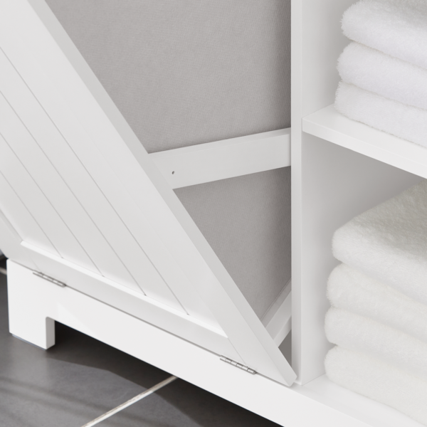 Ši vonios spintelė išsiskiria iš kitų, nes turi integruotą skalbinių krepšį, kuris leidžia patogiai laikyti nešvarius drabužius. Be to, pasvirusi spintelės durų konstrukcija leidžia lengviau pasiekti daiktus.