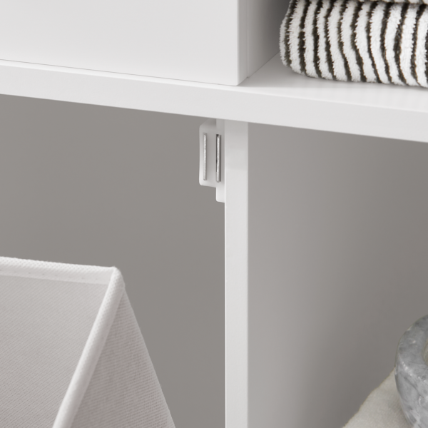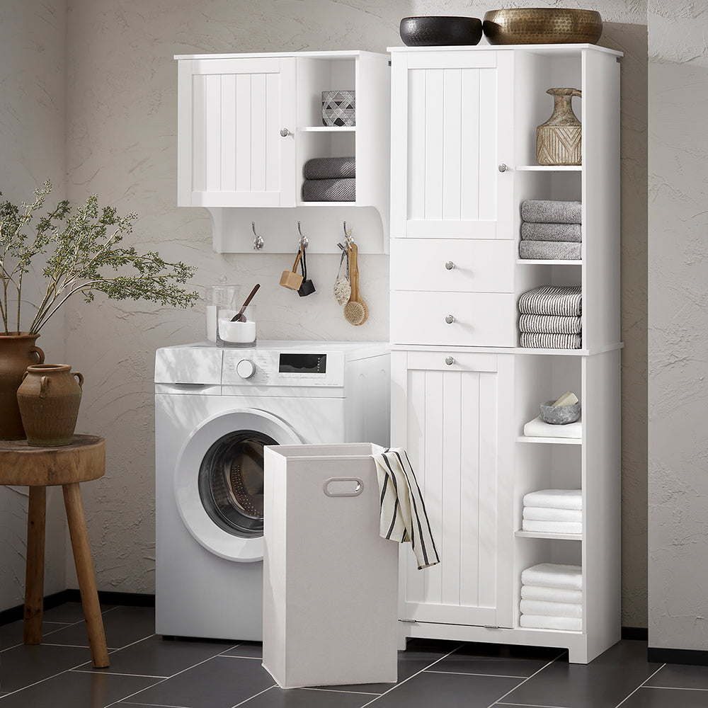 Be apatinės spintelės, skirtos skalbiniams ar kitiems daiktams, trys atviros lentynos viršuje yra puikios popieriniams rankšluosčiams, rankšluosčiams ar kitoms tualeto reikmenims laikyti.