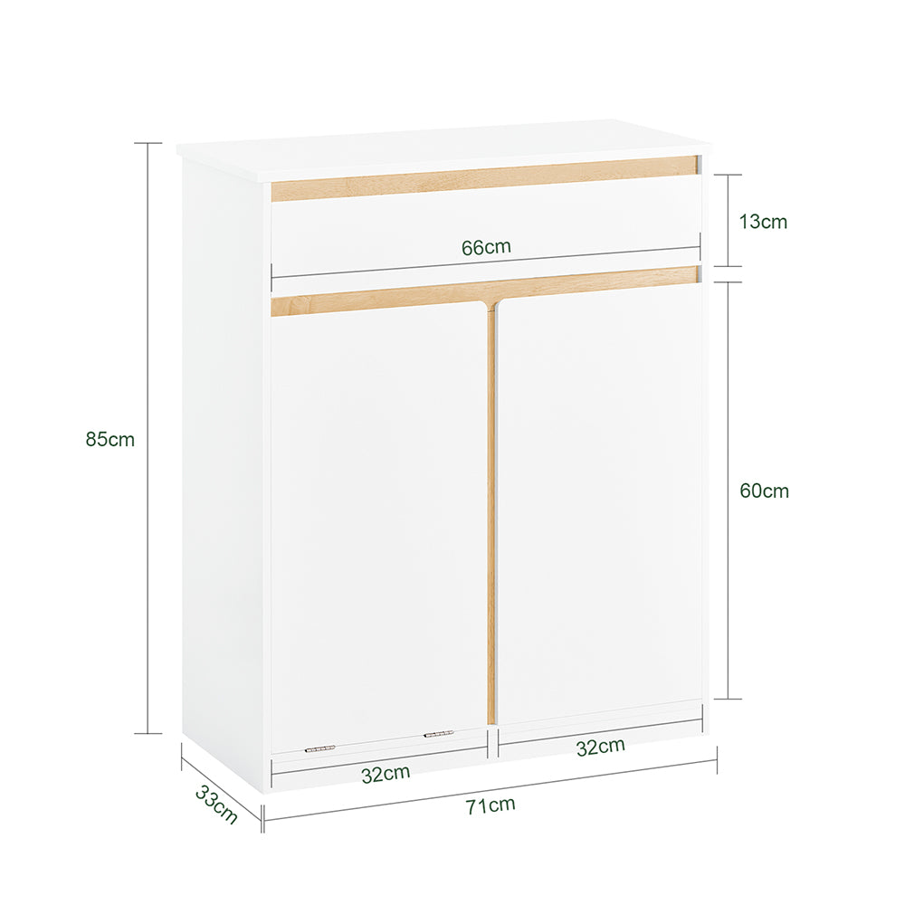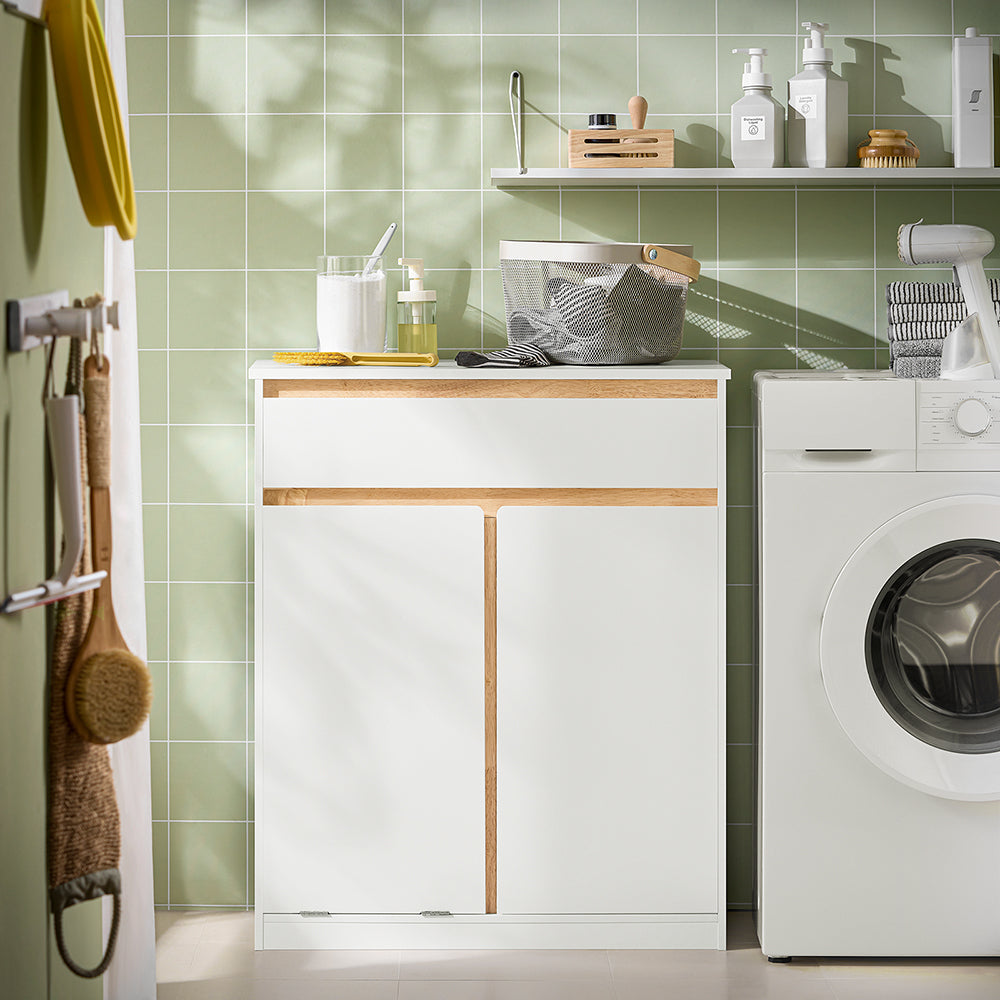 Ši pastatoma vonios spintelė 71x33x85 cm, baltos/šviesiai rudos spalvos, yra puikus sprendimas jūsų vonios kambariui. Ji ne tik suteikia elegancijos, bet ir funkcionalumo, nes turi integruotą skalbinių krepšį.