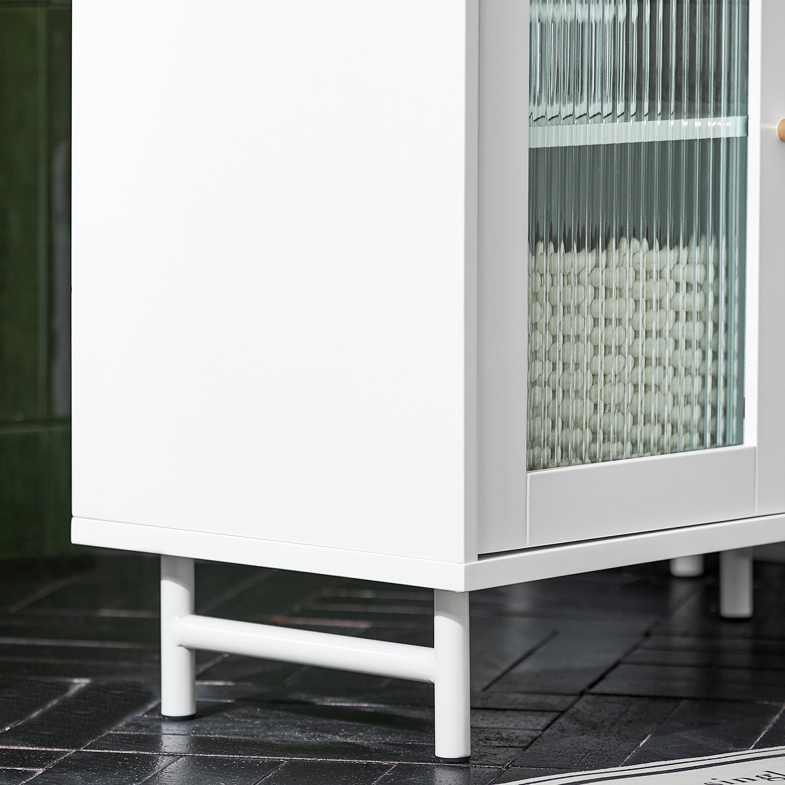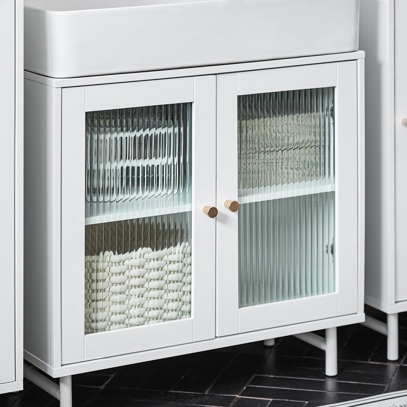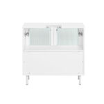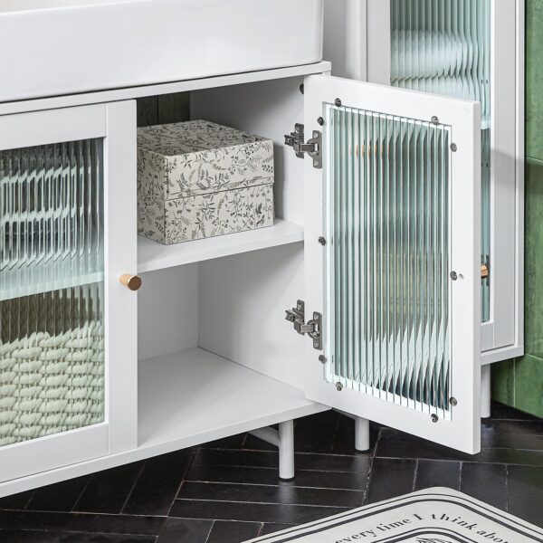 Stiklinės durys ne tik apsaugo jūsų daiktus nuo dulkių, bet ir leidžia juos matyti. Spintelė yra lengvai surenkama ir gali būti derinama su kitais SoBuy serijos vonios baldais.