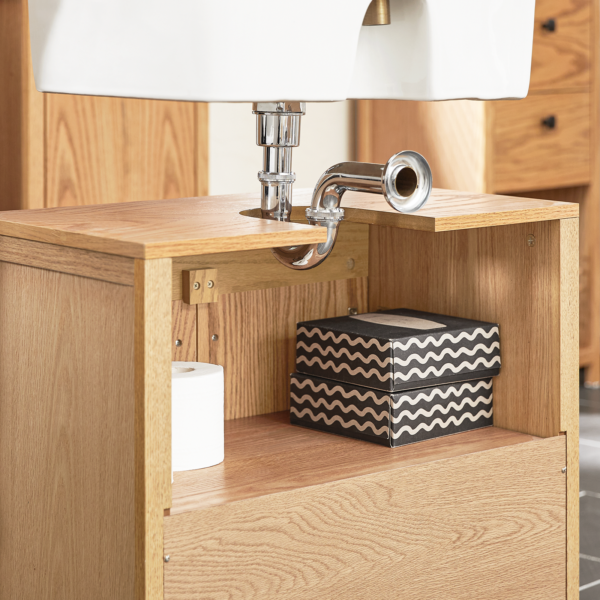 Ši elegantiška ir praktiška pastatoma vonios spintelė po kriaukle yra puikus pasirinkimas jūsų vonios kambariui. Su dviem durimis, ji suteikia ne tik estetinį vaizdą, bet ir funkcionalumą, leidžiantį optimaliai išnaudoti erdvę po kriaukle.