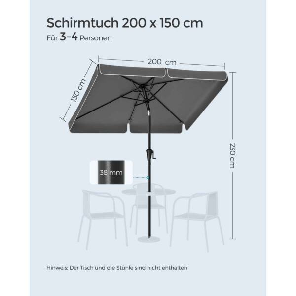 Skėčio audinio dydis yra 200 x 150 cm, o aukštis vertikaliai siekia 220 cm, todėl jis suteiks pakankamai šešėlio ir apsaugos nuo saulės.