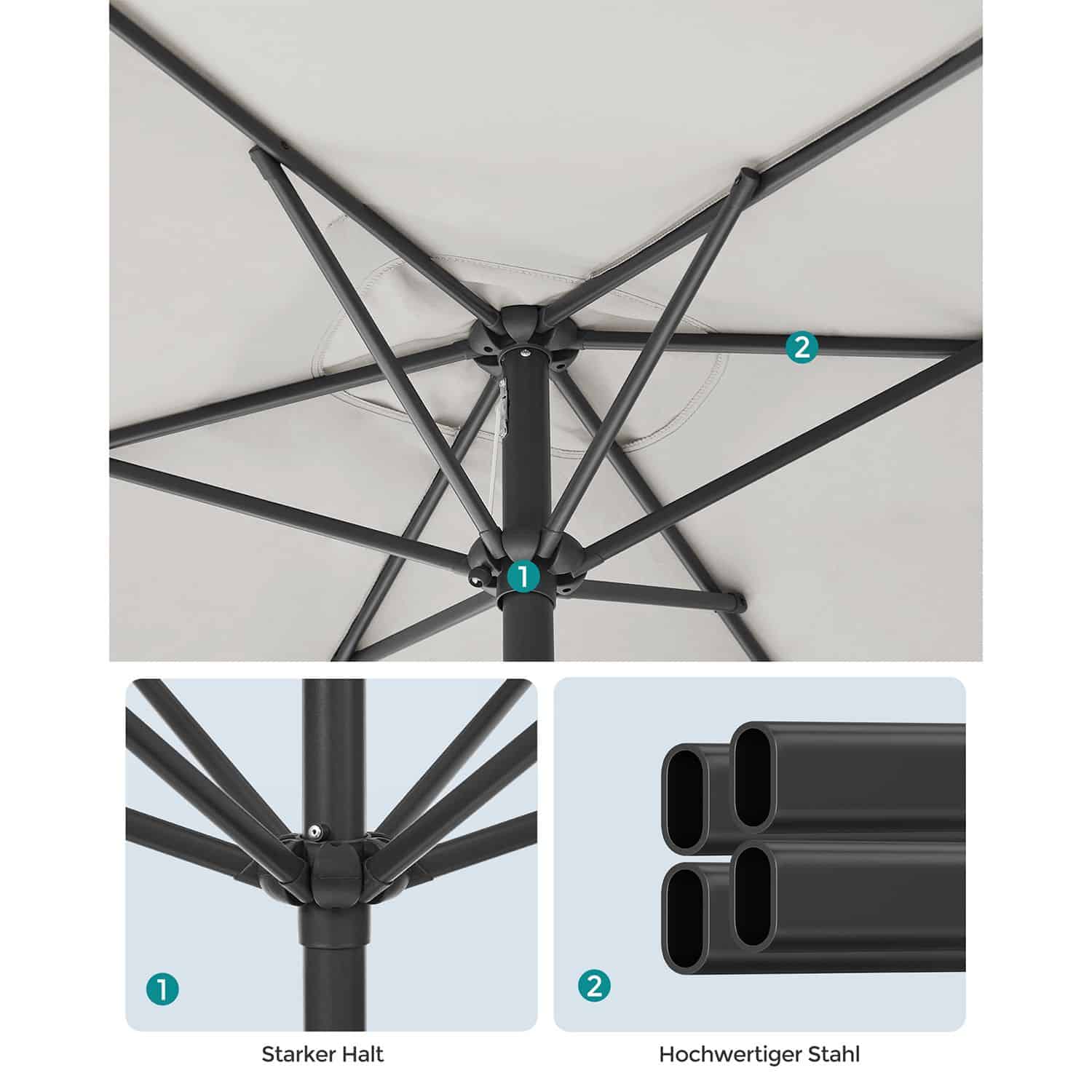 Skėtis pagamintas iš aukštos kokybės medžiagų, užtikrinančių ilgaamžiškumą ir patikimumą. Plieninis rėmas suteikia tvirtumą, o 180 g/m² poliesterio audinys apsaugo nuo UV spindulių ir yra atsparus blukimui.