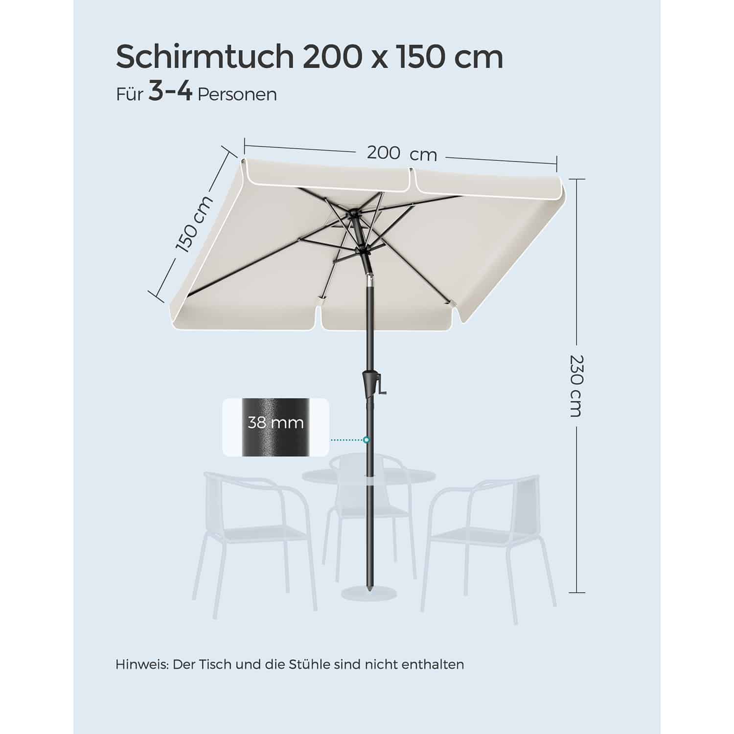 Skėčio audinio dydis yra 200 x 150 cm, todėl jis suteikia pakankamai šešėlio didesnei erdvei. Vertikalus aukštis siekia 220 cm, o skėčio kotas yra 38 mm skersmens, kas užtikrina stabilumą ir lengvą montavimą.