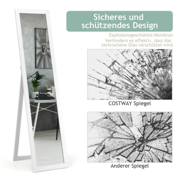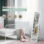 Pastatomas veidrodis 37x50x155cm baltos spalvos puikiai tinka miegamajam, persirengimo kambariui ar prieškambariui. Veidrodis pagamintas iš MDF rėmo ir flotacinio stiklo, užtikrinant aiškų atspindį be iškraipymų. Galima naudoti kaip laisvai stovintį arba pakabinamą ant sienos veidrodį.
