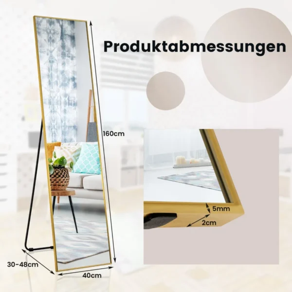 Pastatomas veidrodis 48x40x160 cm, auksinės ir juodos spalvos, skirtas patogiam viso kūno atspindžiui. Veidrodis puikiai tinka miegamajam, svetainei ar prieškambariui, užimant nedaug vietos dėl galimybės tiek pastatyti, tiek pakabinti.