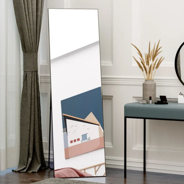Pradėkite savo dieną puikiai pasiruošę su viso ilgio veidrodžiu iš HOMCOM. Švarus ir šiuolaikiškas dizainas be vargo įsilies į jūsų namus ir suteikia kambariui ypatingo įspūdį. Šis dekoratyvinis veidrodis, pagamintas iš aliuminio lydinio ir tvirto plieno laikiklio, garantuoja ilgaamžiškumą. Veidrodį galima pastatyti ant sulankstomo rėmo arba saugiai pritvirtinti prie sienos, kad jūsų kambaryje būtų įvairių dekoravimo galimybių.