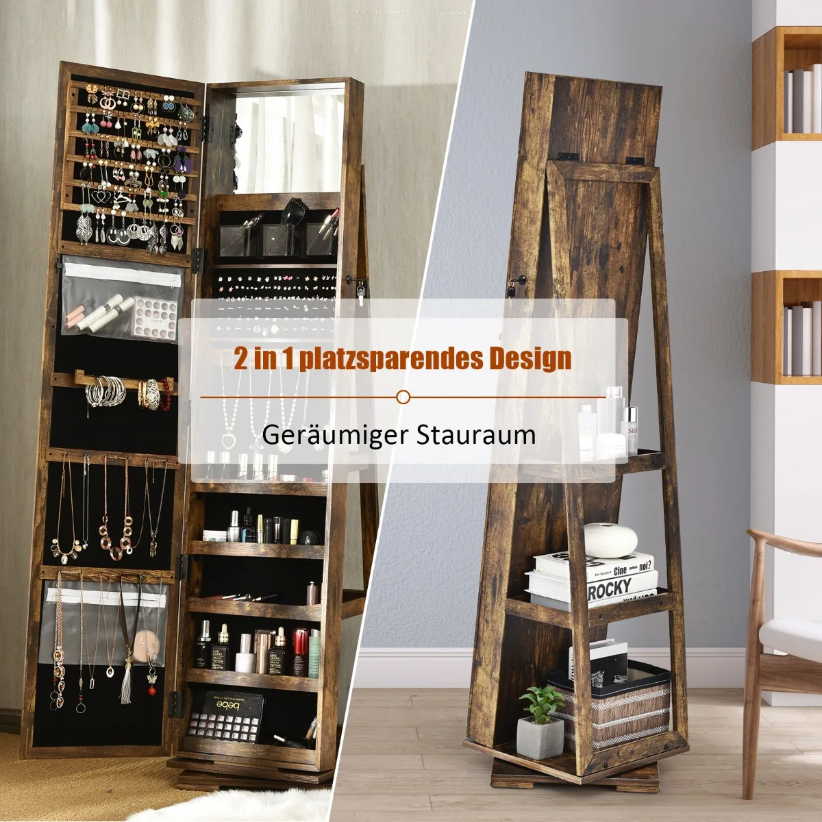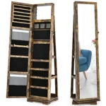Pastatomas veidrodis-papuošalų spintelė 38x38x161 cm yra praktiškas sprendimas papuošalų saugojimui ir kasdieniam naudojimui. Rudos ir juodos spalvos derinys tinka įvairiems interjerams, o veidrodis leidžia patogiai apsirengti nuo galvos iki kojų. Spintelė pasižymi dideliu talpumu ir funkcionalumu, tinkama įvairių juvelyrinių dirbinių organizavimui.
